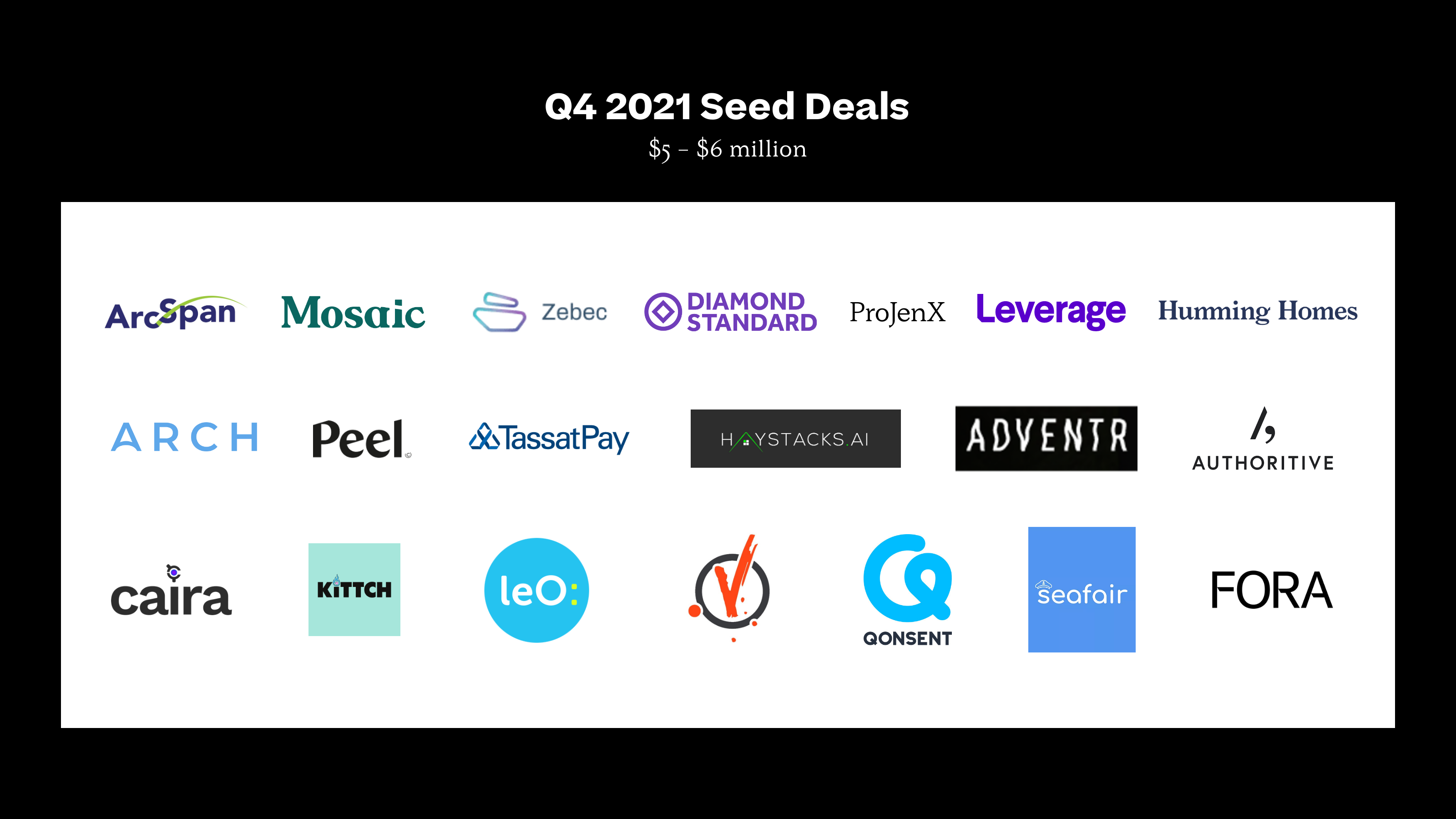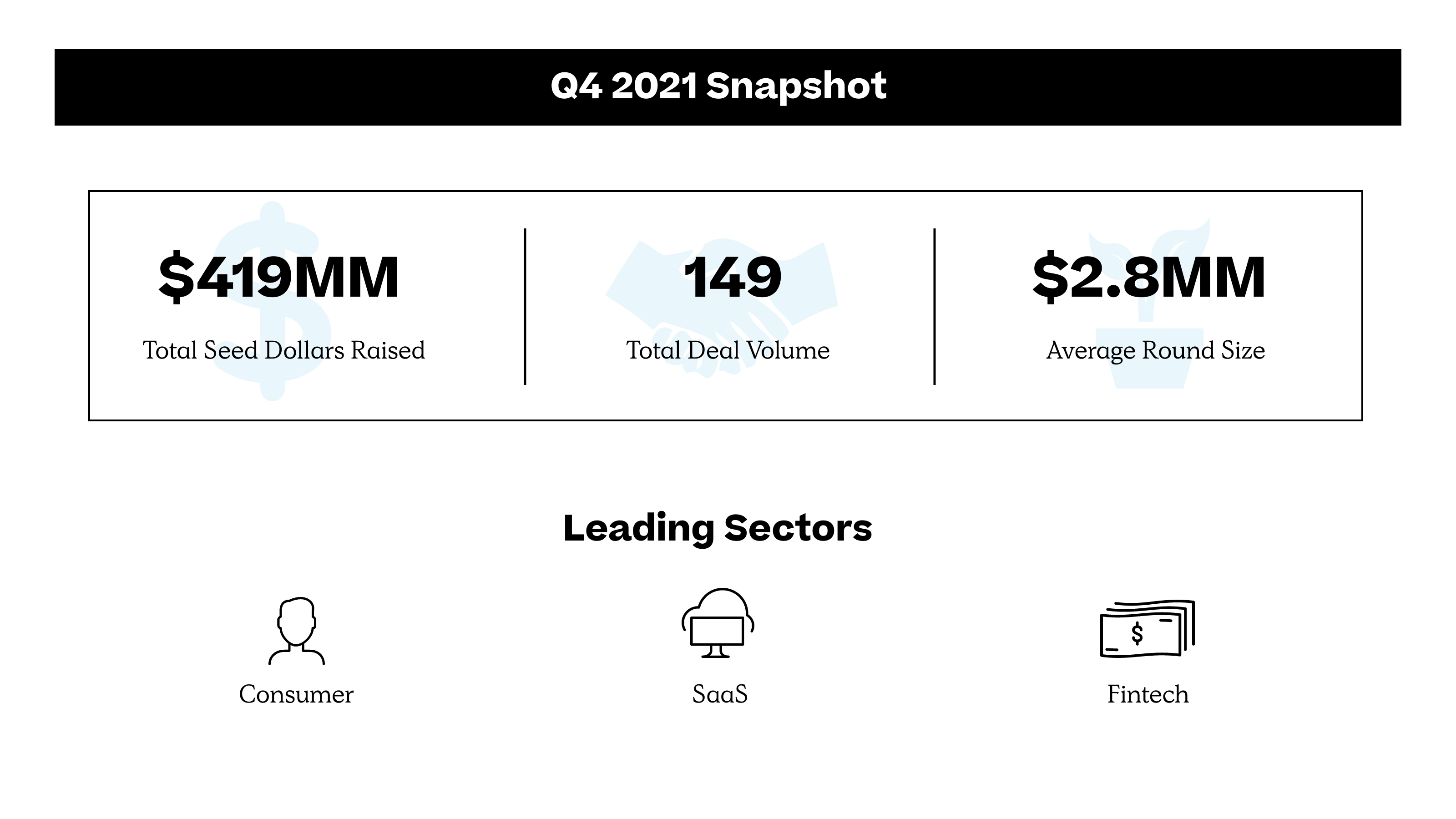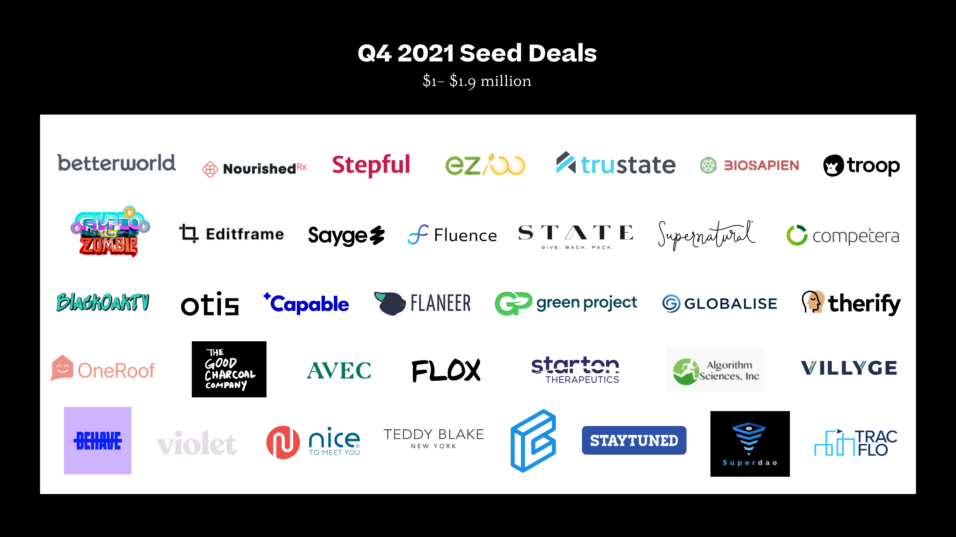 This is a 15% increase compared to the record set just the previous quarter and a 116% increase compared to this time last year. Keep in mind that our analysis has traditionally pulled data for seed deals of up to $6 million; with early-stage rounds getting so much bigger, we’ll likely rethink that framework for 2022 reporting.