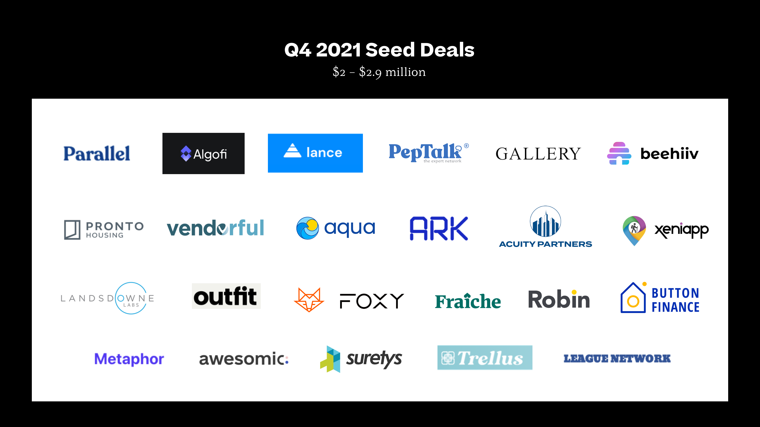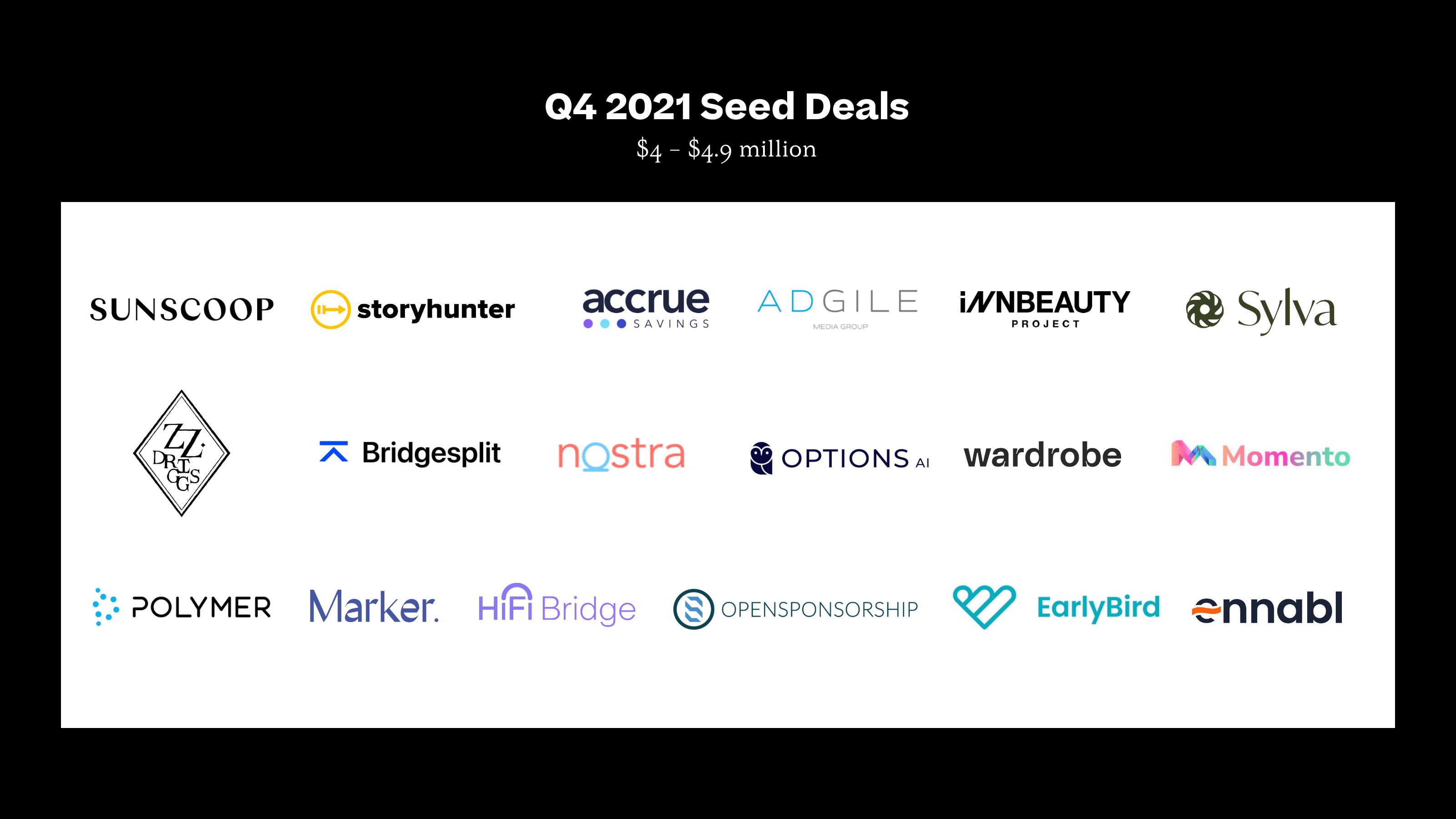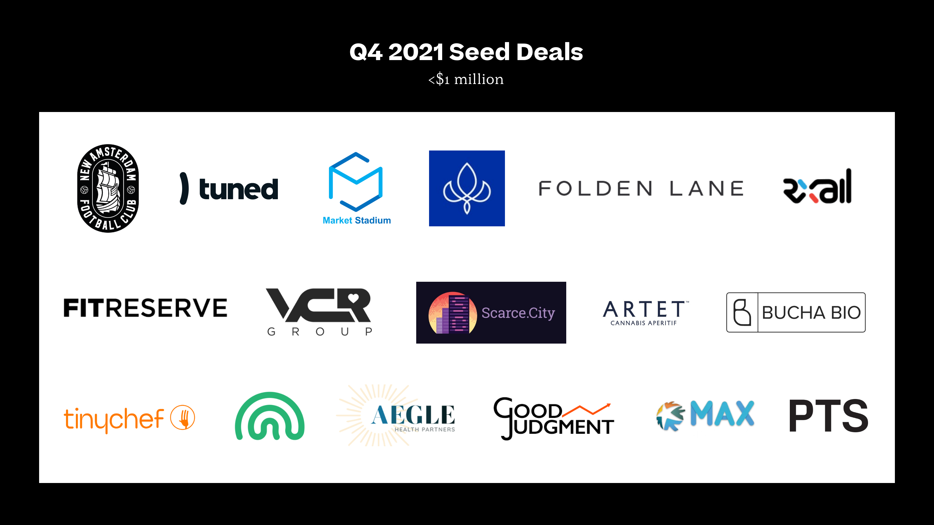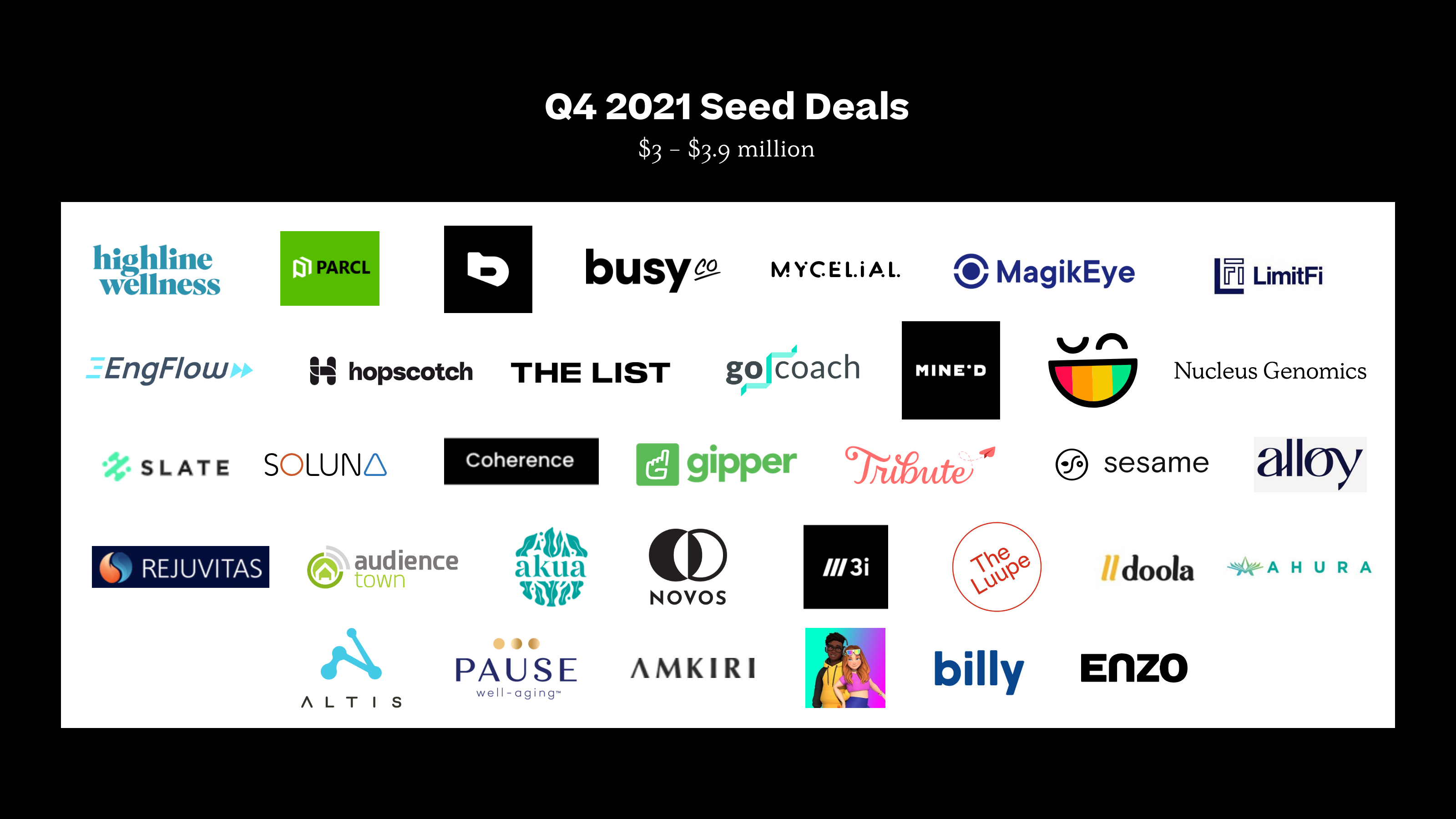 This is a 15% increase compared to the record set just the previous quarter and a 116% increase compared to this time last year. Keep in mind that our analysis has traditionally pulled data for seed deals of up to $6 million; with early-stage rounds getting so much bigger, we’ll likely rethink that framework for 2022 reporting.