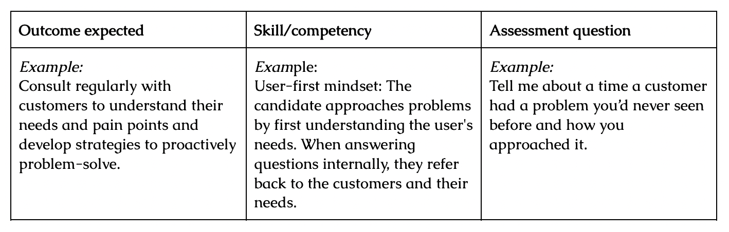 An assessment process should be unbiased and data driven. For every skill, experience, and capability included in the ideal candidate profile, determine the two to three questions. Repeat these questions with every candidate. Candidates can then be compared in a consistent manner against each other, and against the objective requirements for the role. Ideally, you structure an interview guide that is used for every interview, an example below.