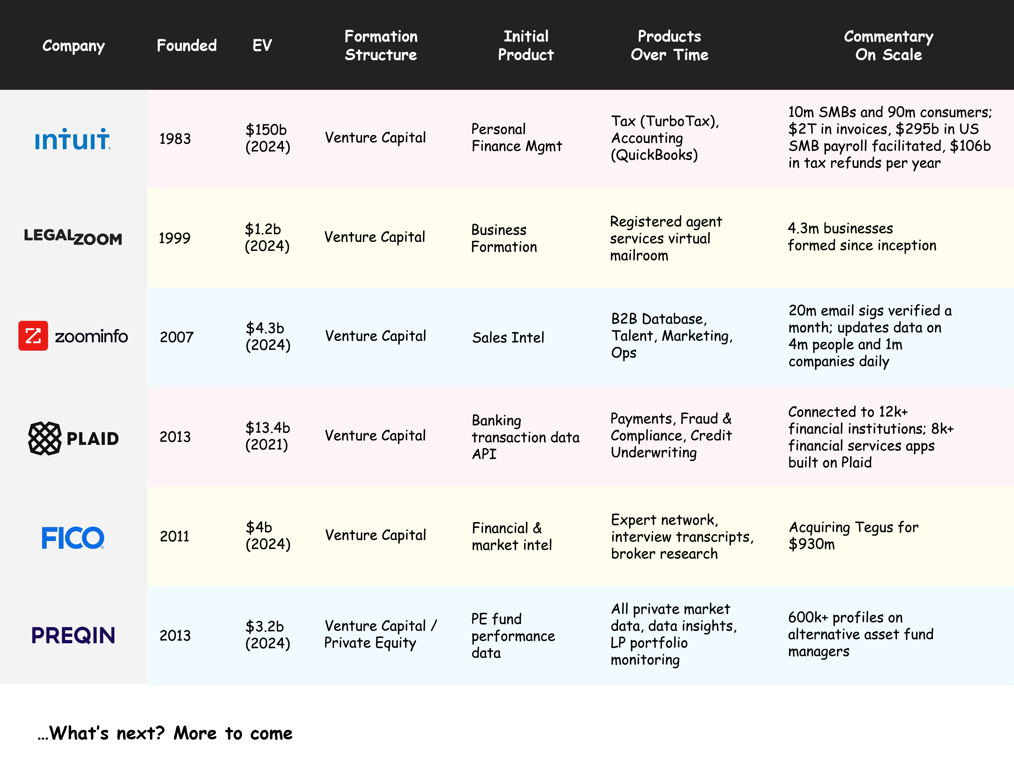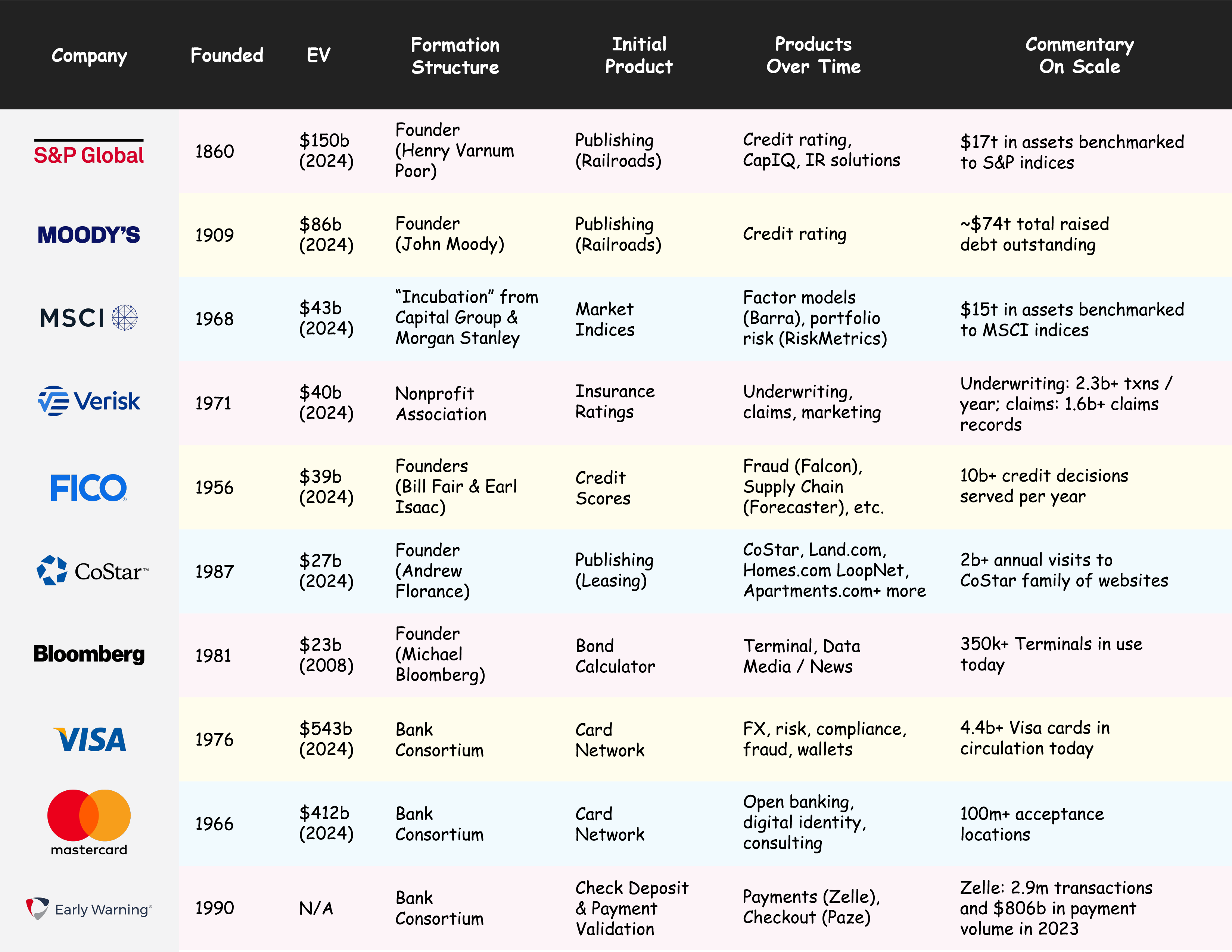 We started by asking: if we study the origins of financial data businesses, can we (a) reverse engineer their paths to juggernaut-dom and (b) reconcile those paths with venture capital as a funding source tuned for hypergrowth (vs. slow-and-steady growth over years or decades)?
