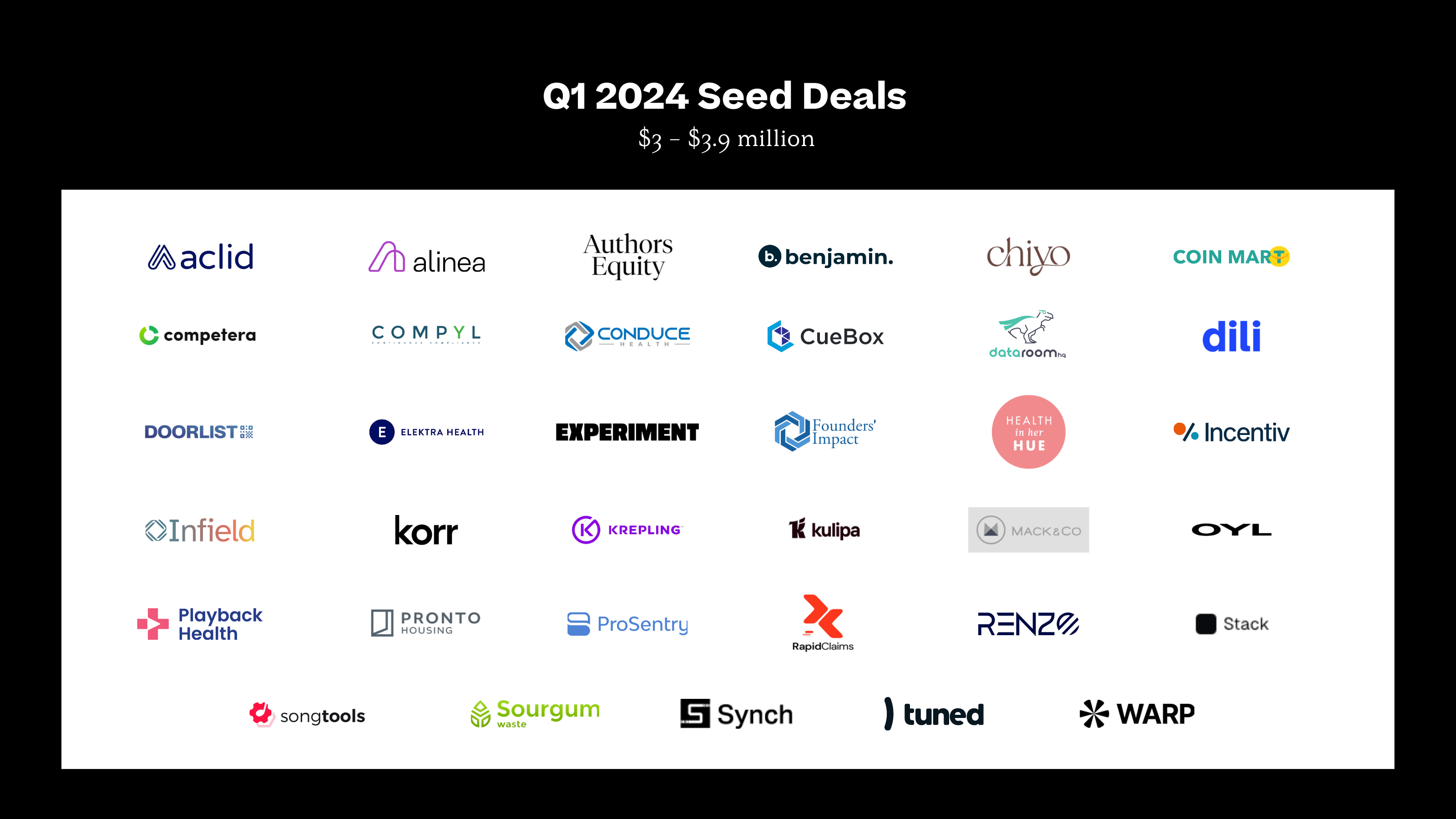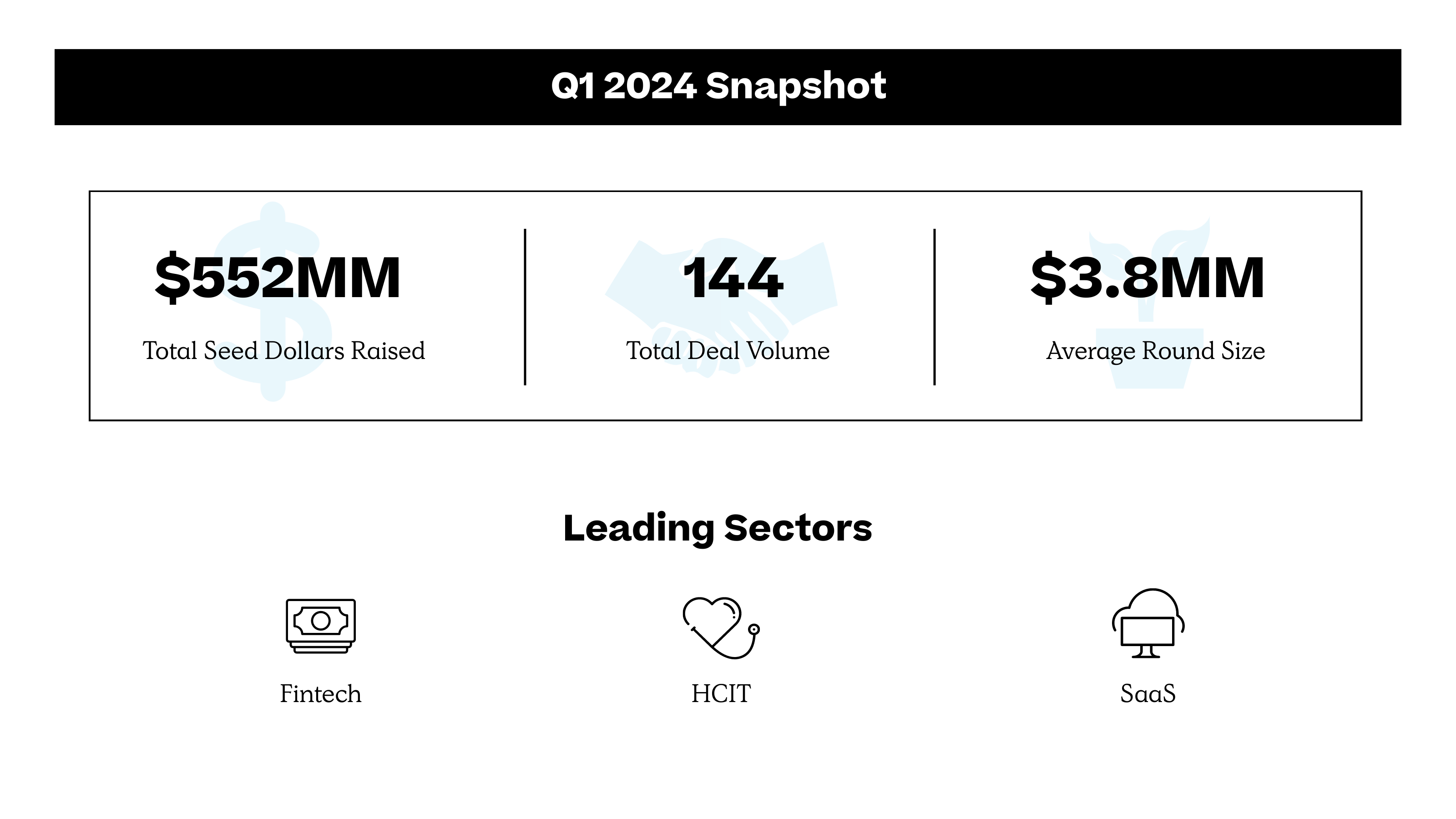In Q1 2024, we saw steady continuation in the NYC seed fundraising ecosystem. Quarterly deal volume stayed roughly the same compared to Q3 2023, with average round size and total funding decreasing 5% and 6%, respectively. While SaaS, Fintech, and Healthcare deals continued to dominate the show, we saw a decrease in Edtech + Future of Work deals.