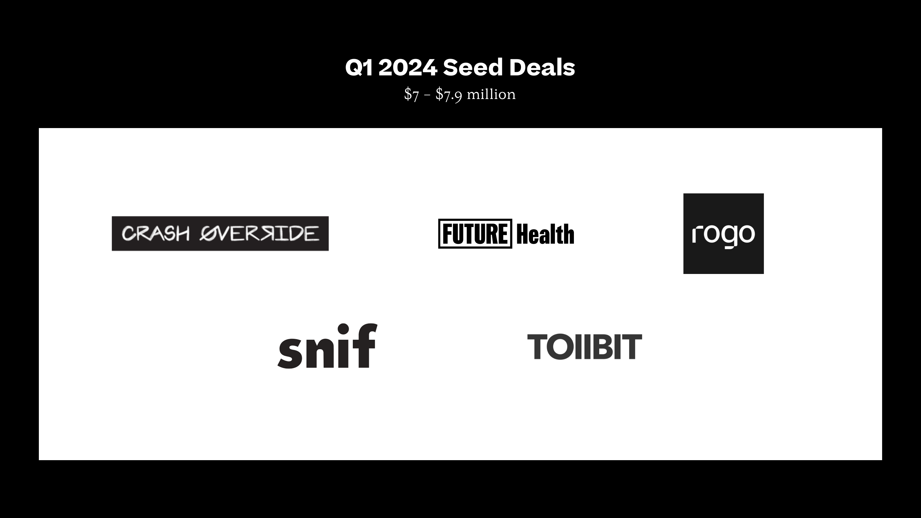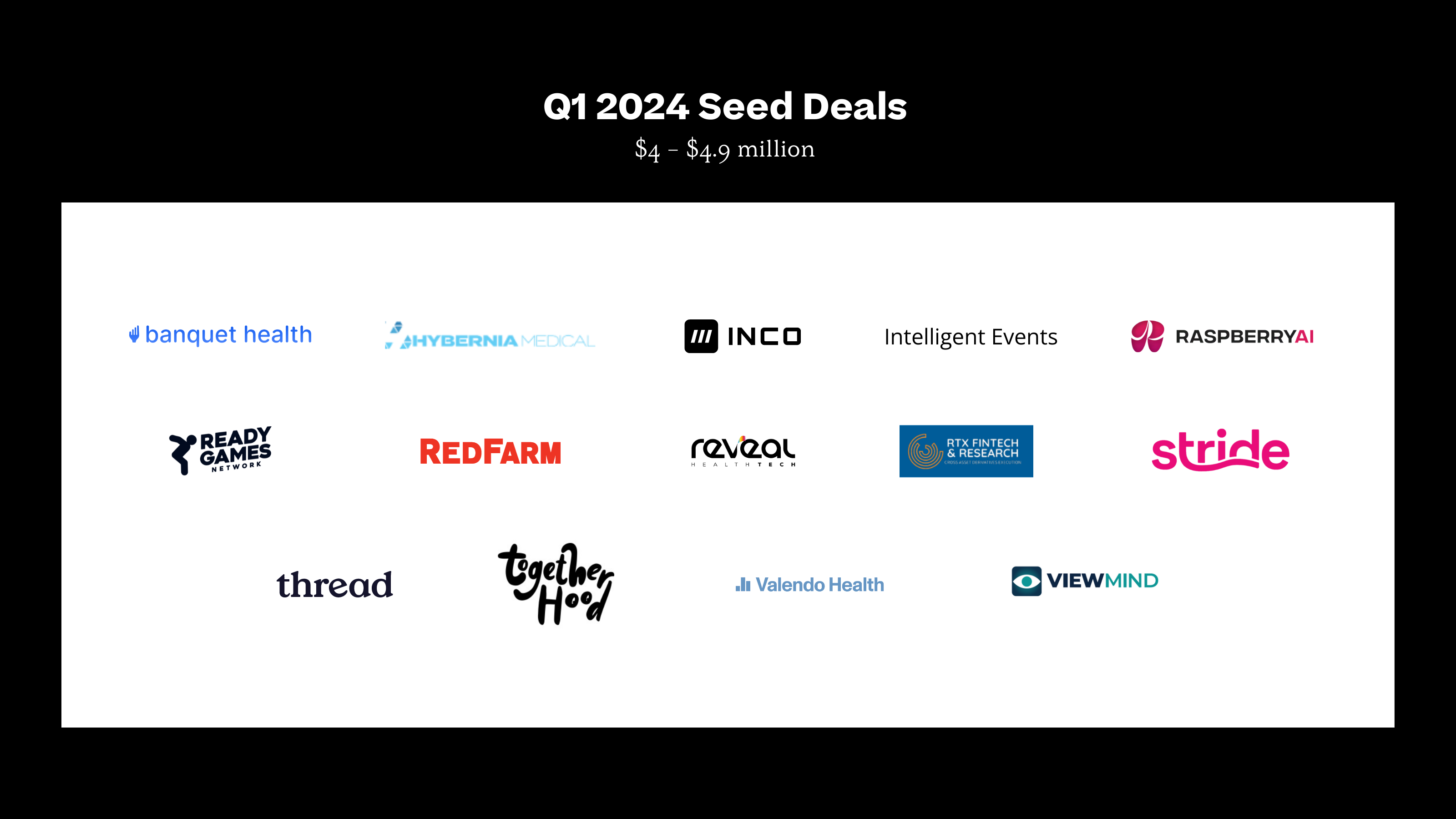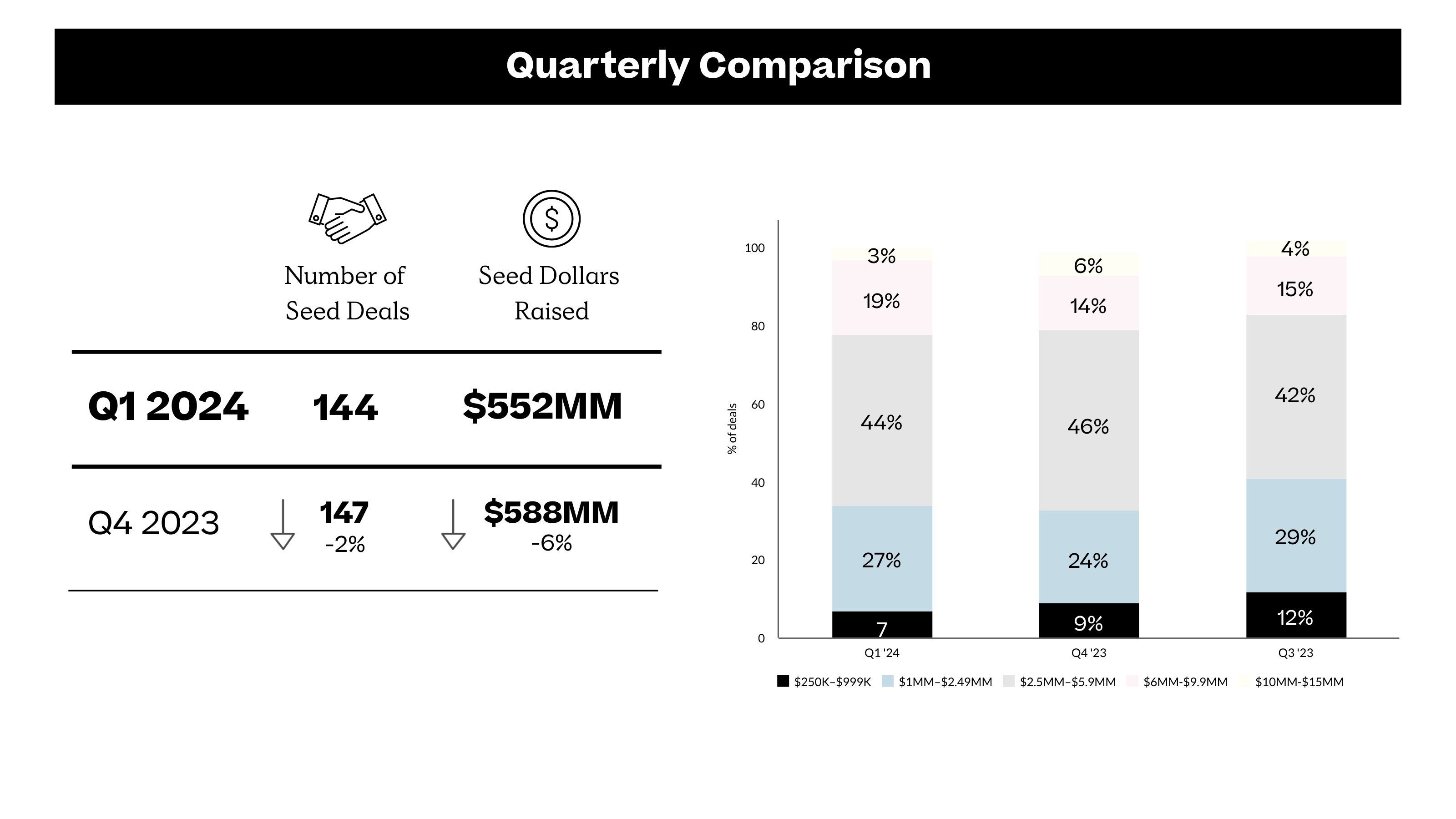 Year over year, we continue to see sustained growth in NYC’s seed-stage deals. Total deal volume has increased 16% to 146 this past quarter, up from 126 in Q1 last year. While the number of deals has grown the past year, we also noticed a 19% decline in the average round size—from $4.5M in Q1 2023 to $3.8M in Q1 2024.