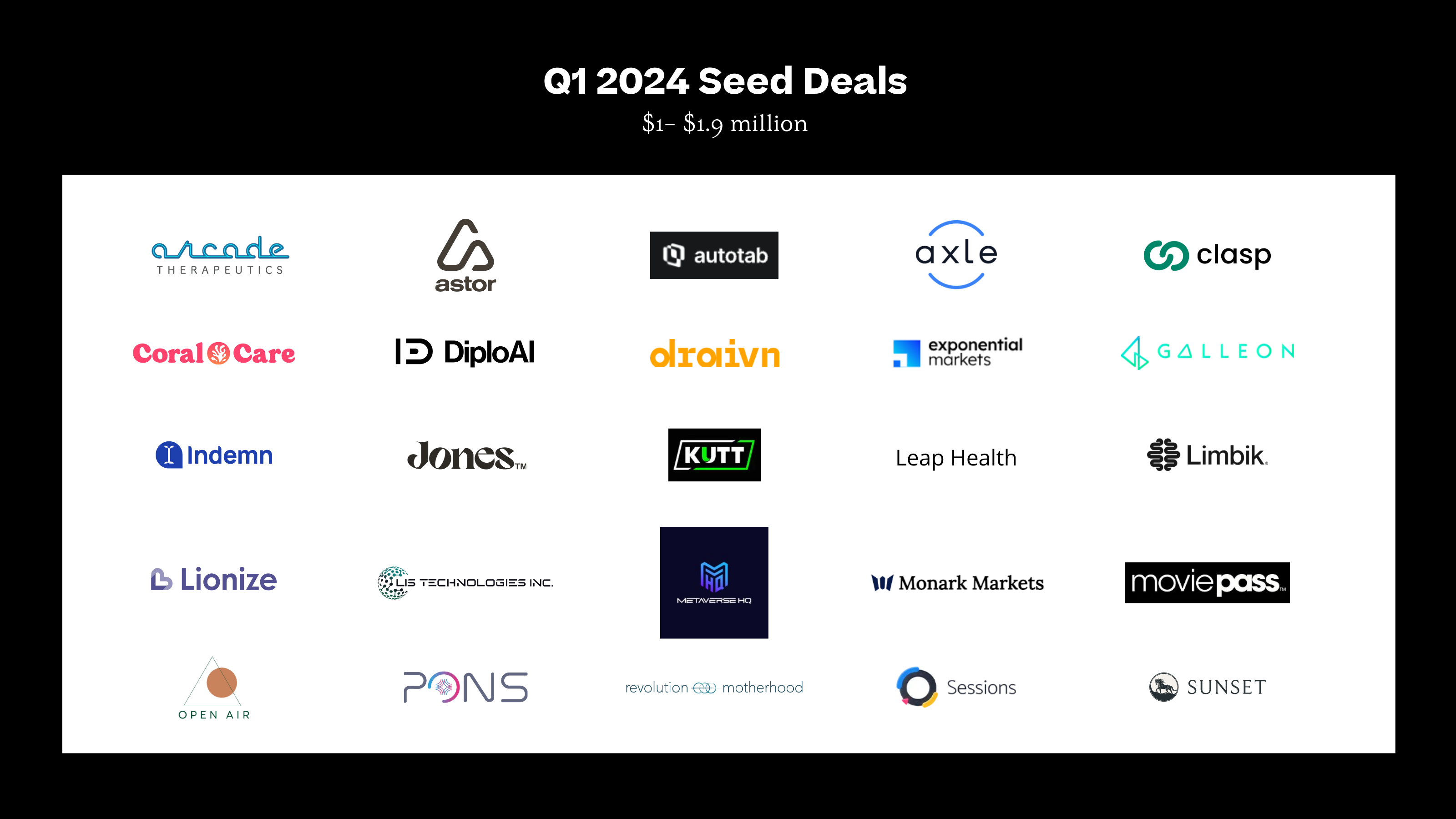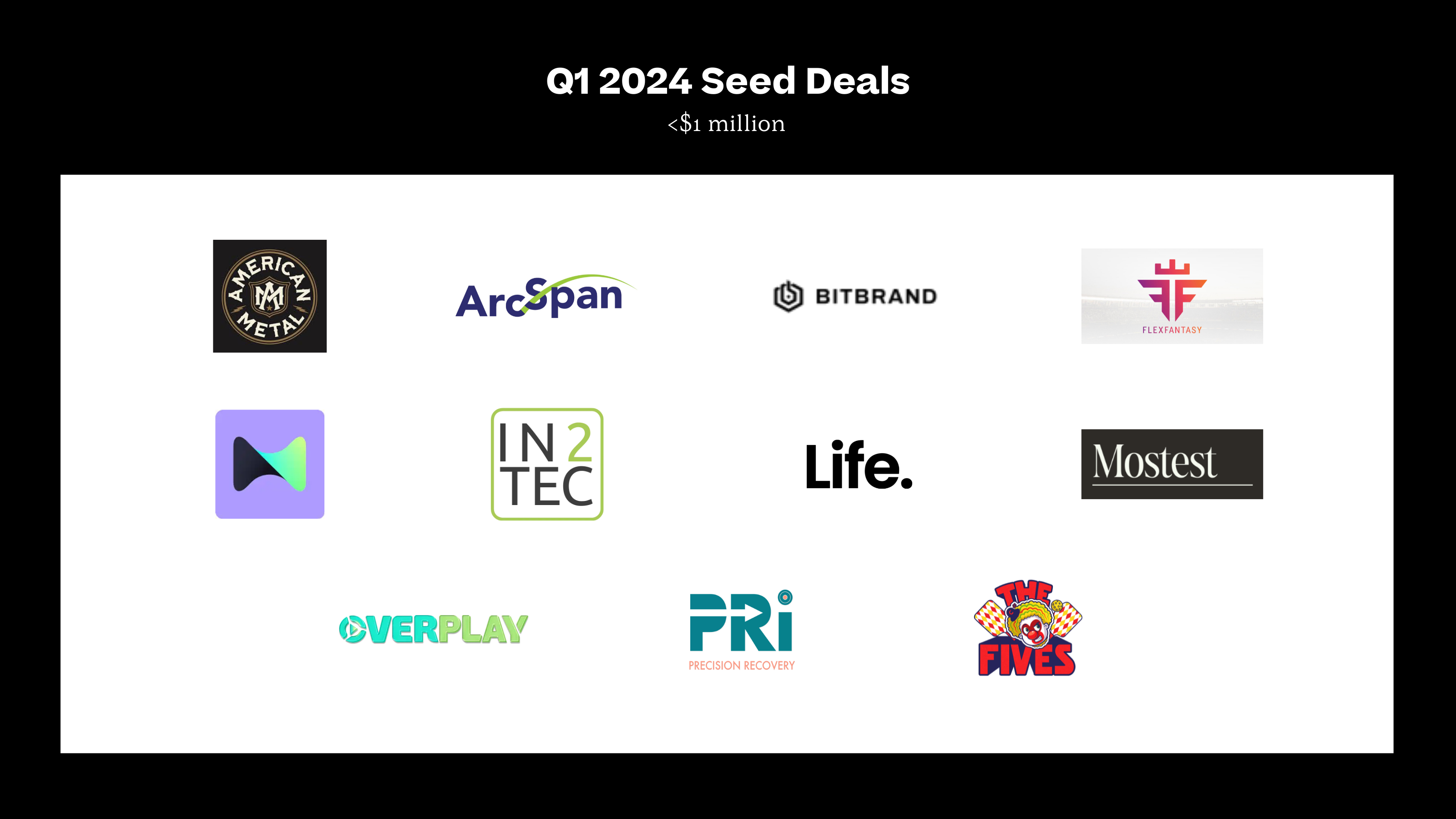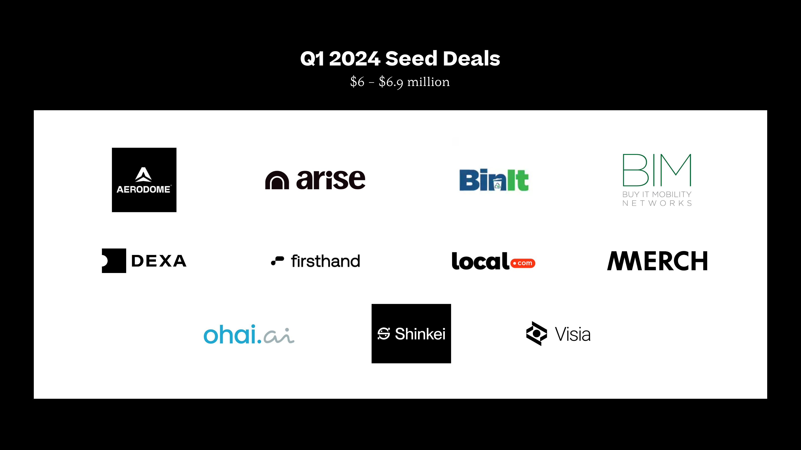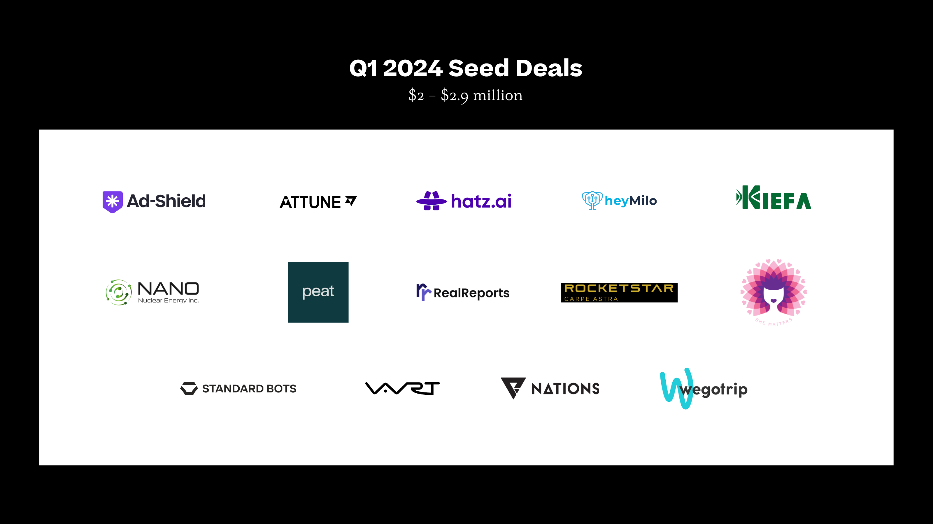 Year over year, we continue to see sustained growth in NYC’s seed-stage deals. Total deal volume has increased 16% to 146 this past quarter, up from 126 in Q1 last year. While the number of deals has grown the past year, we also noticed a 19% decline in the average round size—from $4.5M in Q1 2023 to $3.8M in Q1 2024.
