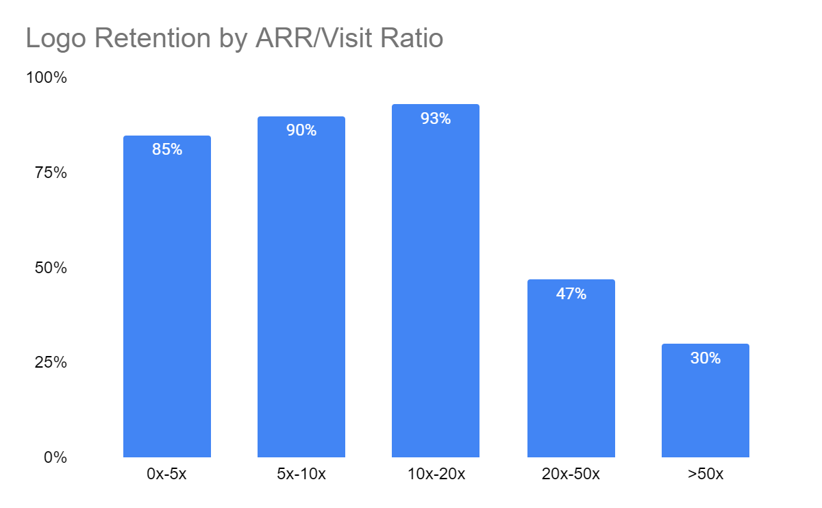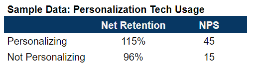 The metrics in the example summary below are not exhaustive, but offer a sense of the types of attributes to consider. For Company X, a client’s ARR was not a significant predictor of net retention, but many other qualitative factors were: leveraging integrations, attending training sessions, using multiple products, etc. More importantly though, the analysis considered customer and product performance metrics in addition to just binary qualitative traits, which proved very revealing. The % change in the client’s monthly site visits is an intuitive customer health metric: when the customer’s volume declines, so does their net retention rate. The % change in monthly ARR/visits is a proxy for customer value: the lower the multiple, the stickier the customer.