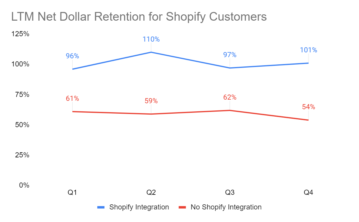 Once you understand which attributes are the leading indicators of net dollar retention, you can also dive deeper into the magnitude of each impact. If an ecommerce enablement business determines a Shopify integration is indicative of a stickier customer, they should understand the net retention delta between a customer using the integration versus not.