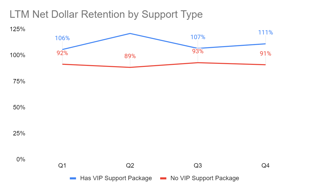 The next chart considers trailing twelve month retention rates based on support packages and suggests that customers who purchase a VIP white glove offering are stickier. This is a surface-level snapshot of the data for the sake of simplicity, but in practice SaaS companies can slice and dice the data even further, e.g. by contract value. In my prior life as an operator, we uncovered such a striking delta in the net retention rates for large customers with VIP support that we mandated that any customer over $300K ARR was required to upgrade to that level.