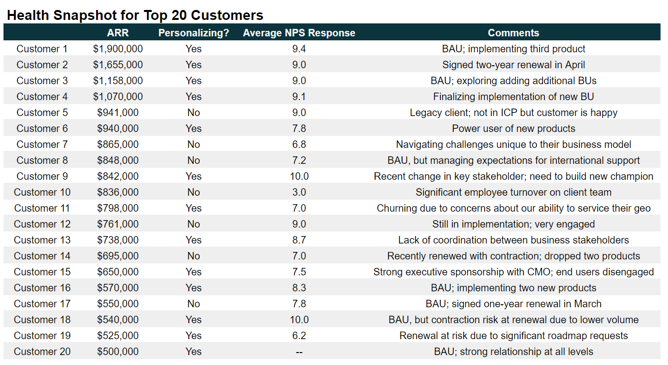 Once you’ve aggregated all of your customer insights, make sure your board metrics are focused on the metrics that really matter. To harp on the Sailthru personalization example, it felt much more relevant to educate board members on which of our top 20 customers were not using the personalization technology than to try to opine on a red/yellow/green sentiment status for them.