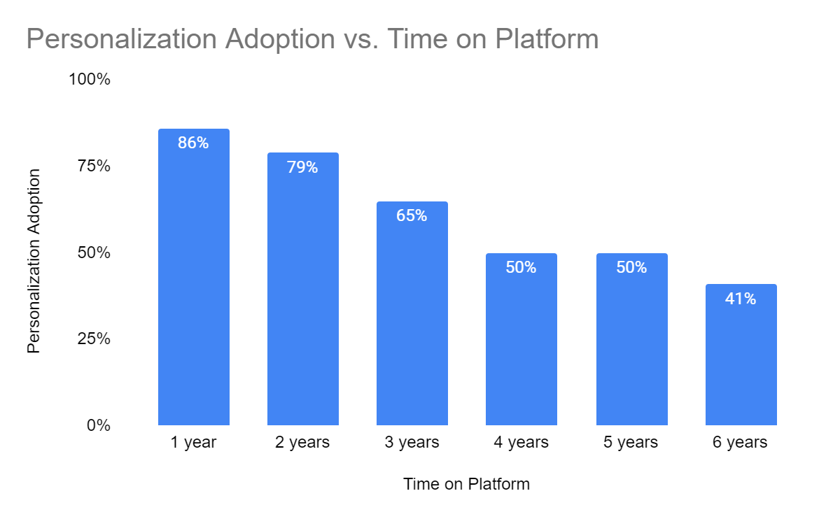 Once we identified this striking difference, we changed our TTV calculation to when customers sent their first communications using our personalization technology, and we didn’t consider an implementation complete until that happened. Yes, the metric looked much worse, but we were okay with that given this behavior had positive long-term benefits. The data below is illustrative only (as is most everything here), but the trend is accurate: we ultimately saw the fruits of our labor in getting newer customers using the technology.