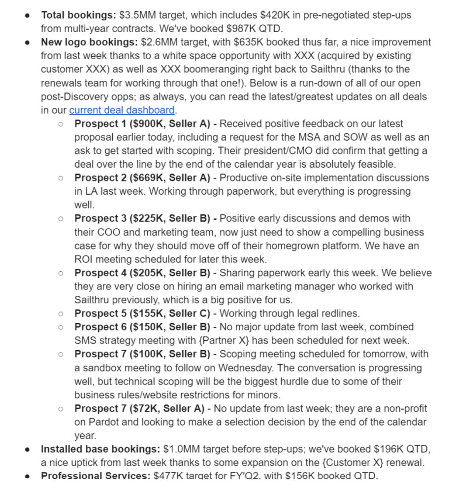 I mentioned at the onset of this installment that effective information cascades are table stakes for any organization, but there are certainly ways to be novel in howyou approach your information cascade. Throughout my many years at Sailthru, I started every week with a signature weekly note where I detailed specific information around how our bookings, pipeline, and churn were shaping up for the quarter (redacted pipeline example below). I was authoring this note for our sales, marketing, and customer success teams, but at one point an engineer got his hands on it and asked that I begin sharing this rundown with the entire company because it was so transparent and helpful. I learned that “building” our execution plan publicly was very powerful in making everyone in the organization feel like they were along for the ride.