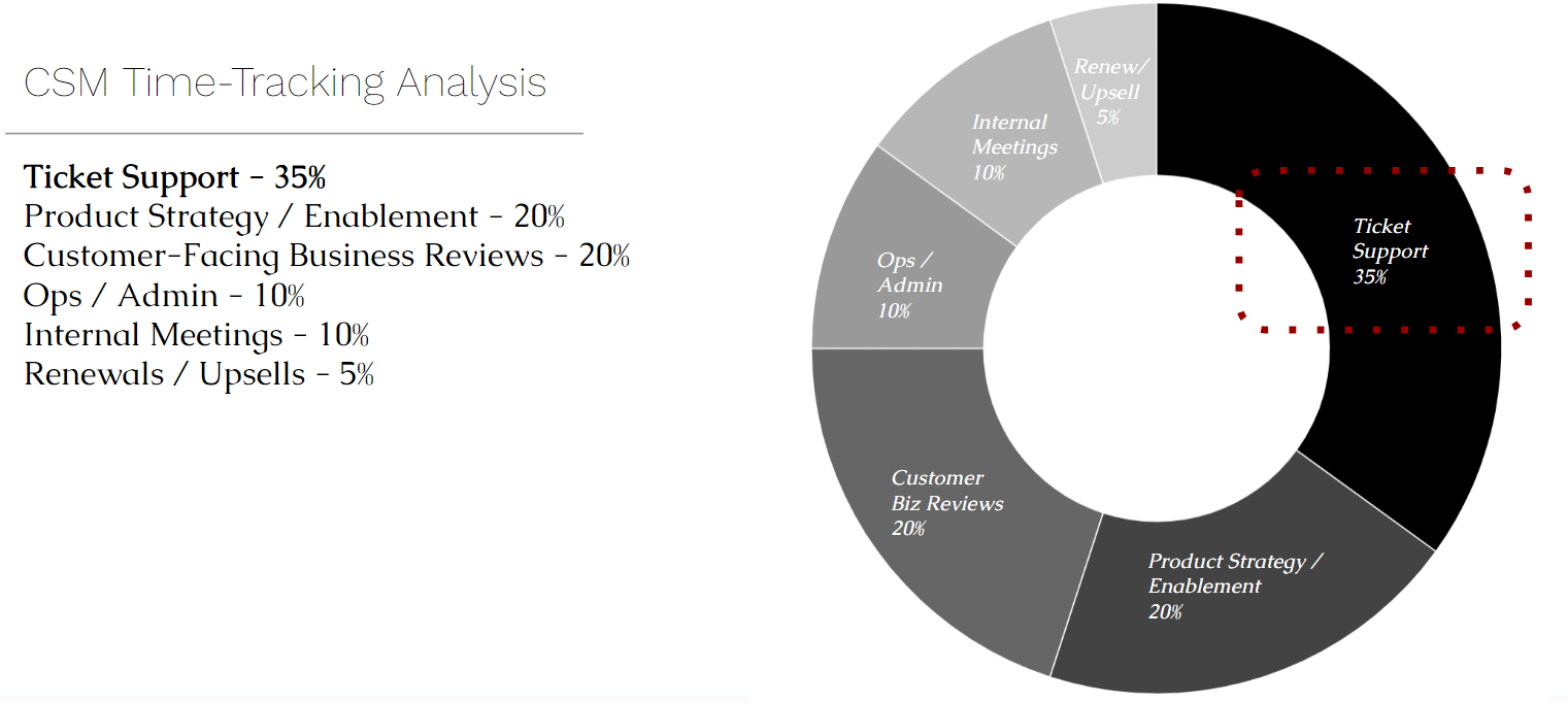There are myriad other ways to interpret the sample data beyond the ticket support example. If 10% of CSM time is spent on operations or administrative matters, how much of that time could be recouped with a dedicated CS ops hire? When I was the CCO at Sailthru, I resisted investing in CS operations for longer than I’m proud to admit. But one day, our VP Customer Success Ellen Terchila (now CCO at Hootsuite) said to me, “if you fund a dedicated CS ops hire, I guarantee you I can increase ARR per CSM by at least 15%”–music to my ears, and she delivered! This is how great CS leaders must think: what investments or changes can be made to get more leverage from your CSMs (or really, any team)?