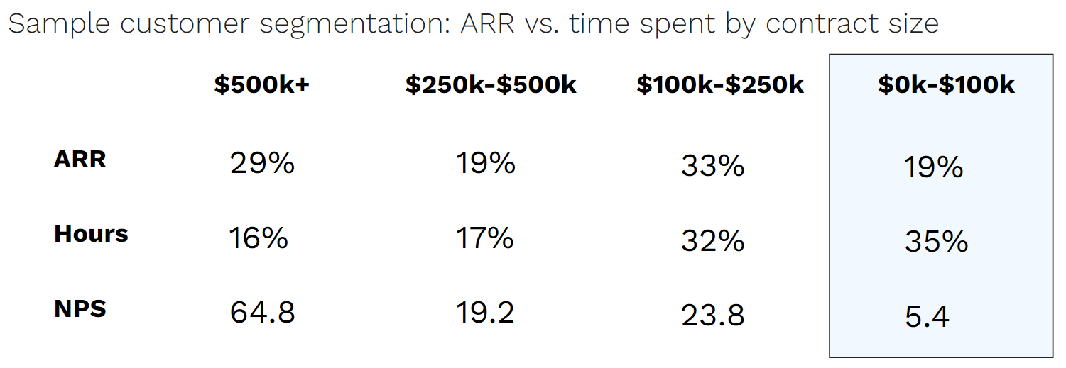 The “shot heard ‘round the world” in this chart is the right-most column: customers paying <$100K per year comprise only 19% of total ARR, but consume 35% of the CSM team’s waking hours. And to add insult to injury, their NPS is significantly lower!