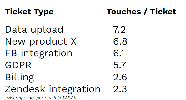 The footnote of this chart also denotes an average cost per touch of $36.81; to calculate that figure, Company X calculated the fully-loaded annual cost of its support team and divided that figure by annual “touch” volume across all tickets.
