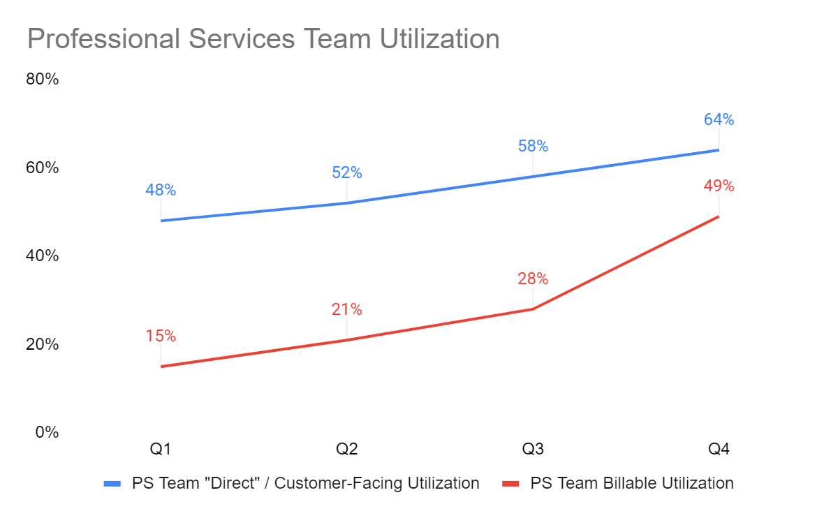 SaaS companies never want to over-index on services revenue, but it is important to cover services expenses (both for new customer implementations and for ongoing ad hoc customer needs). It is even more important for PS teams to track time than it is for CSM teams. With tracking in place, SaaS companies can compare overall customer-facing hours (red line below) with billable customer-facing hours (blue line below), and they’ll often find a striking delta between the two. In this particular example, Company X did a nice job closing the gap between the lines in Q4 (read: they charged customers for more PS work), though I’d argue they are still spending too many hours on non-customer facing work!