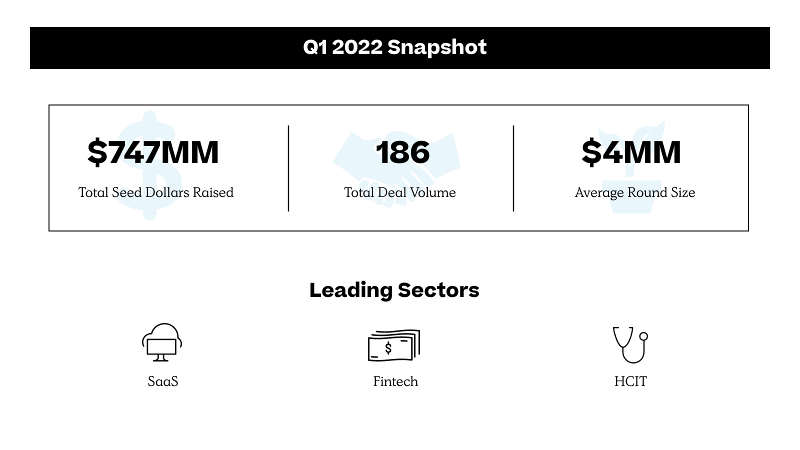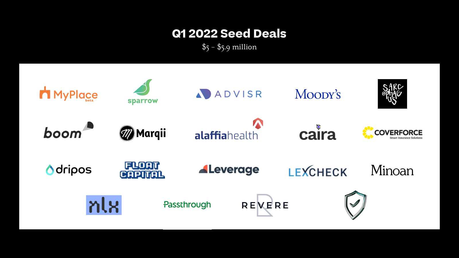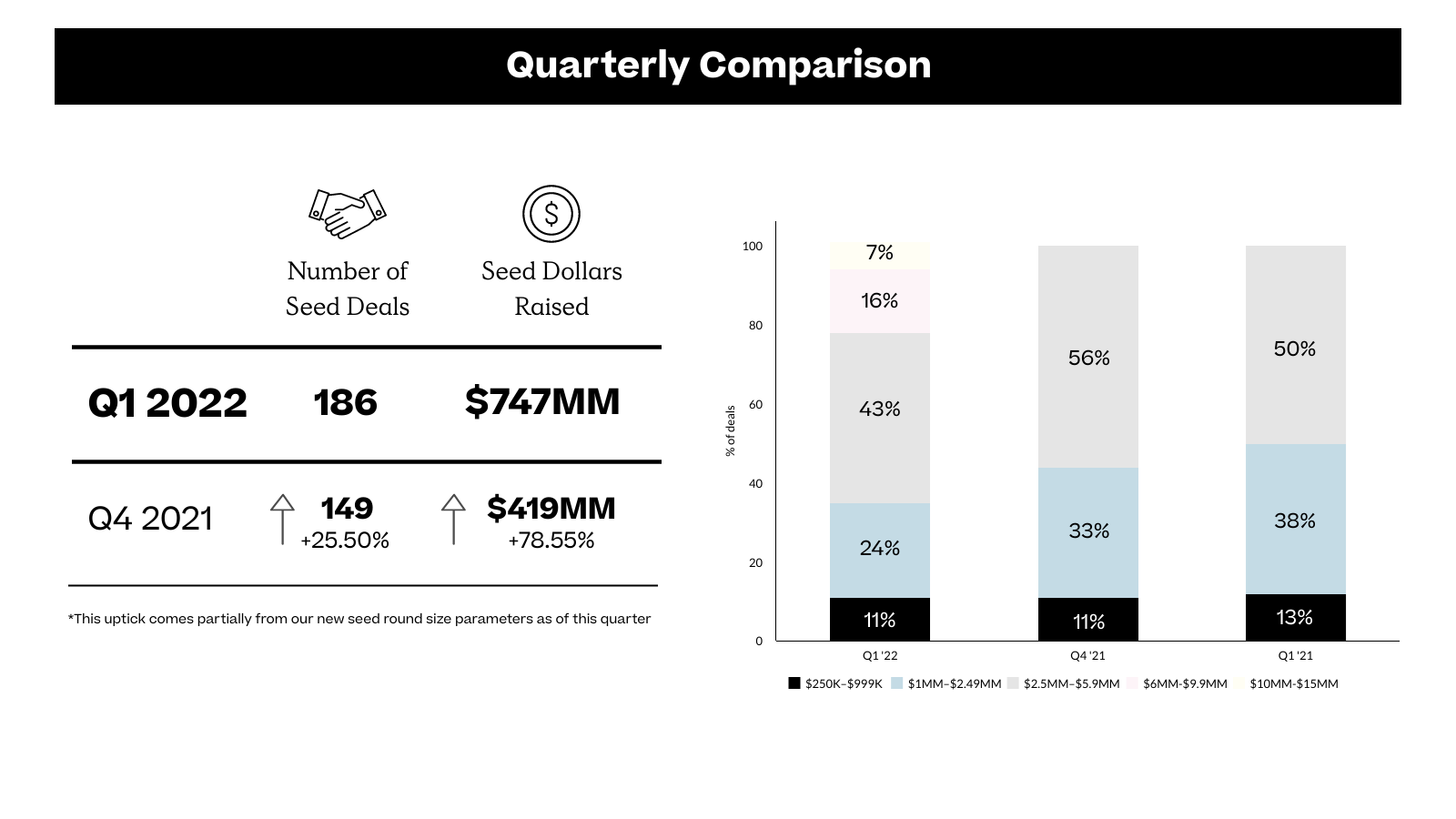 To kick off our record keeping for 2022, we finally got around to something we had been considering since last year: We widened the range of seed deal values we analyze in this report. While previous years’ seed reports tracked deals up to $6 million, that cutoff simply became outdated in this past year’s crazy market. Starting now, we’ll include rounds up to $15 million—we’re seeing nearly 25% of all deals this quarter fall in that range.