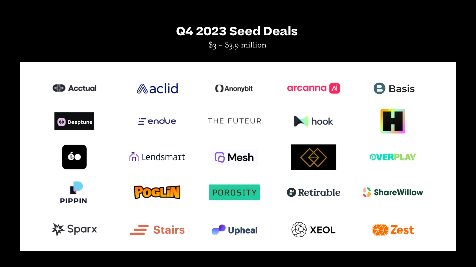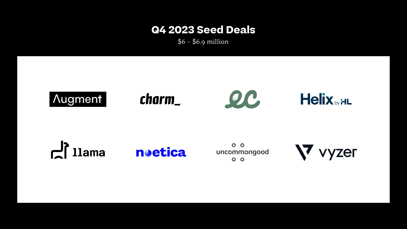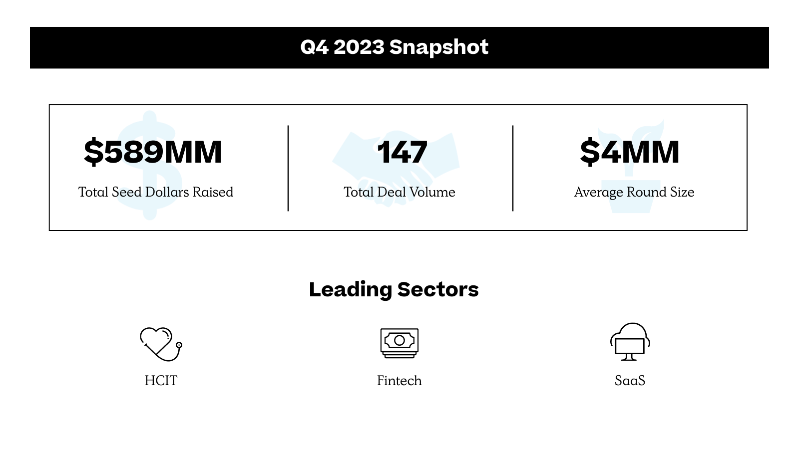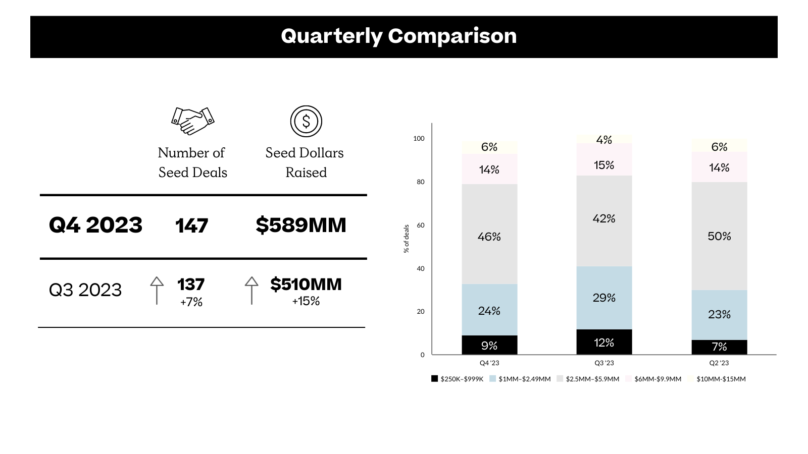 NYC seed deal volume, at 147 total, increased by 7% compared to Q3, and the average amount raised, $4 million, increased by 16%. We know Q4 is typically big for fundraising, and that showed with total funding raised increasing by 15%.