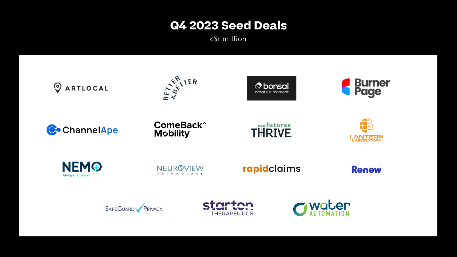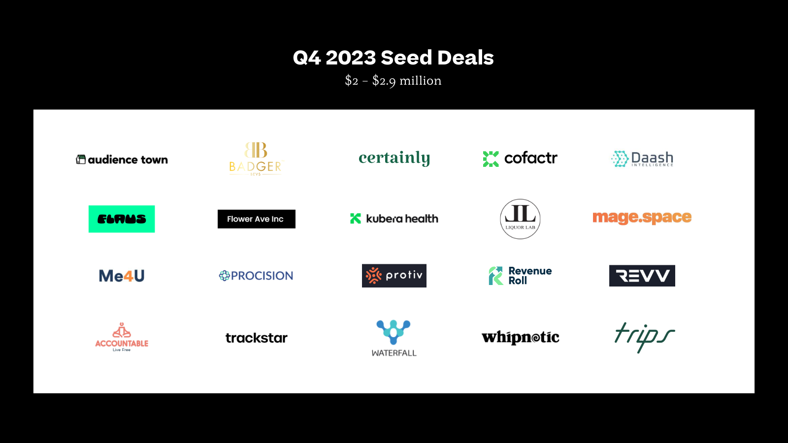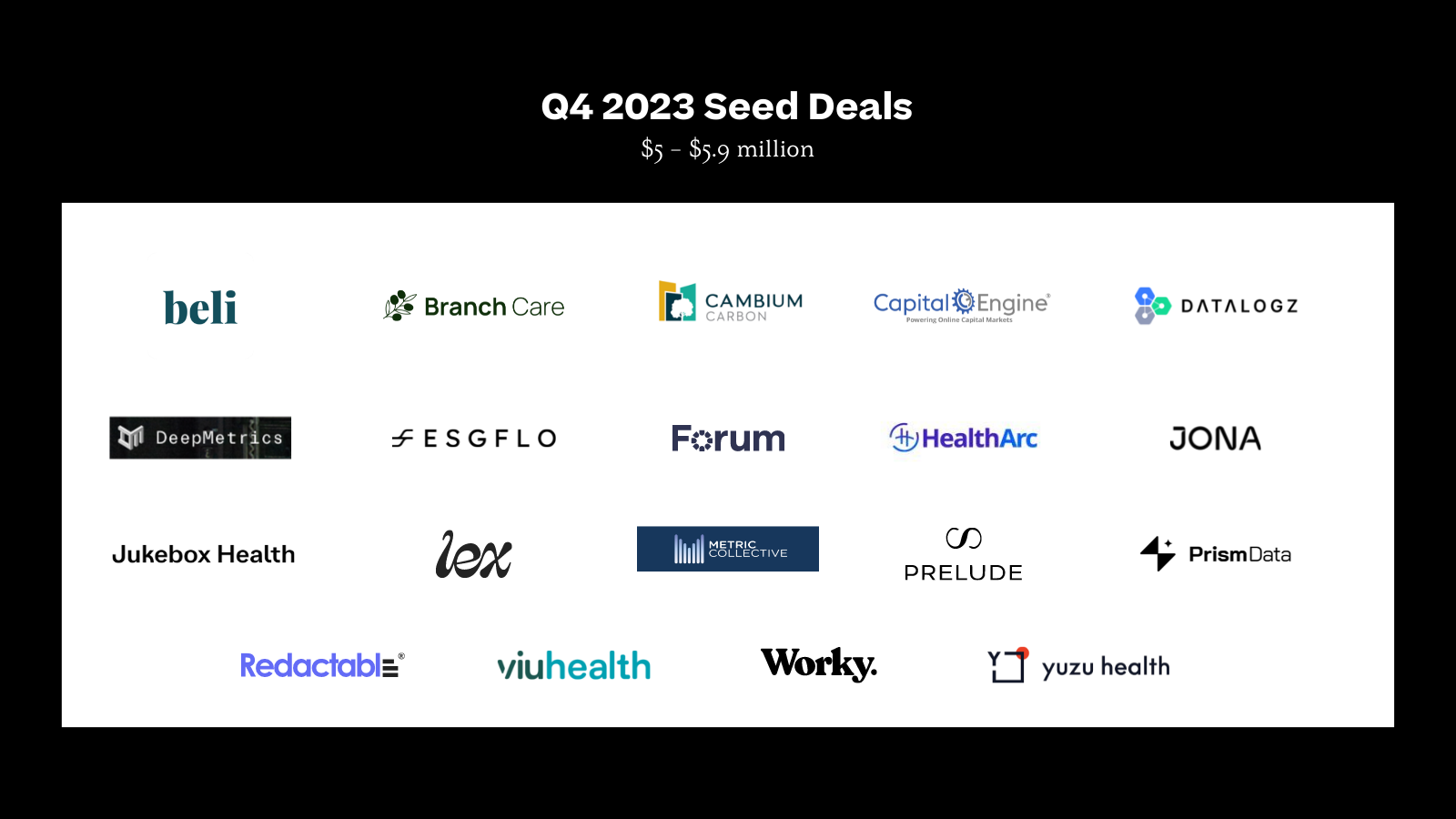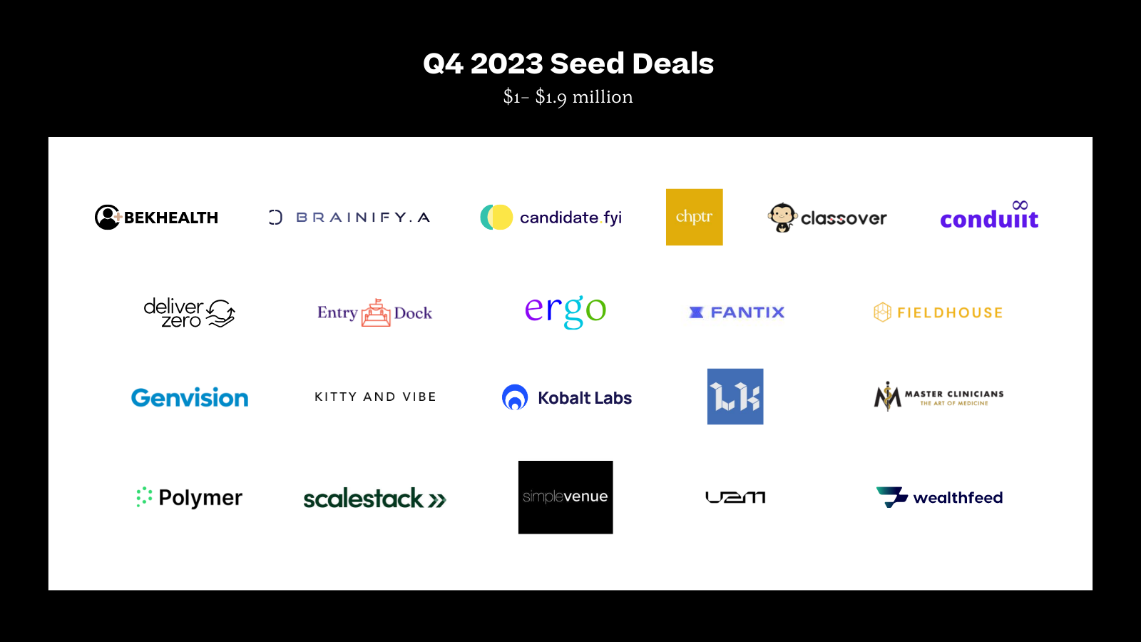 NYC seed deal volume, at 147 total, increased by 7% compared to Q3, and the average amount raised, $4 million, increased by 16%. We know Q4 is typically big for fundraising, and that showed with total funding raised increasing by 15%.