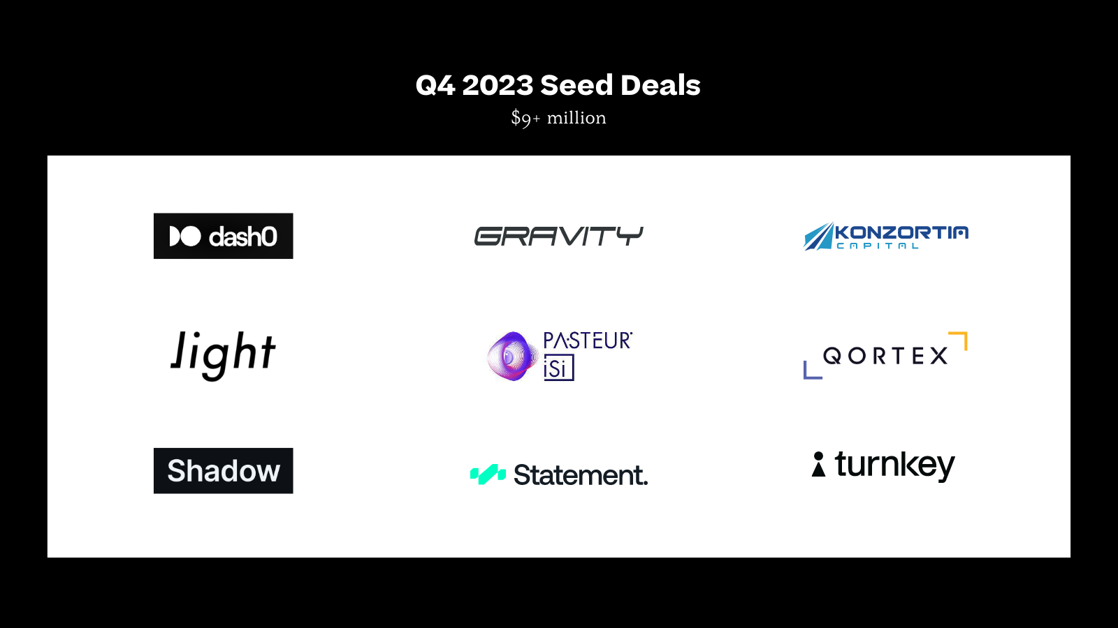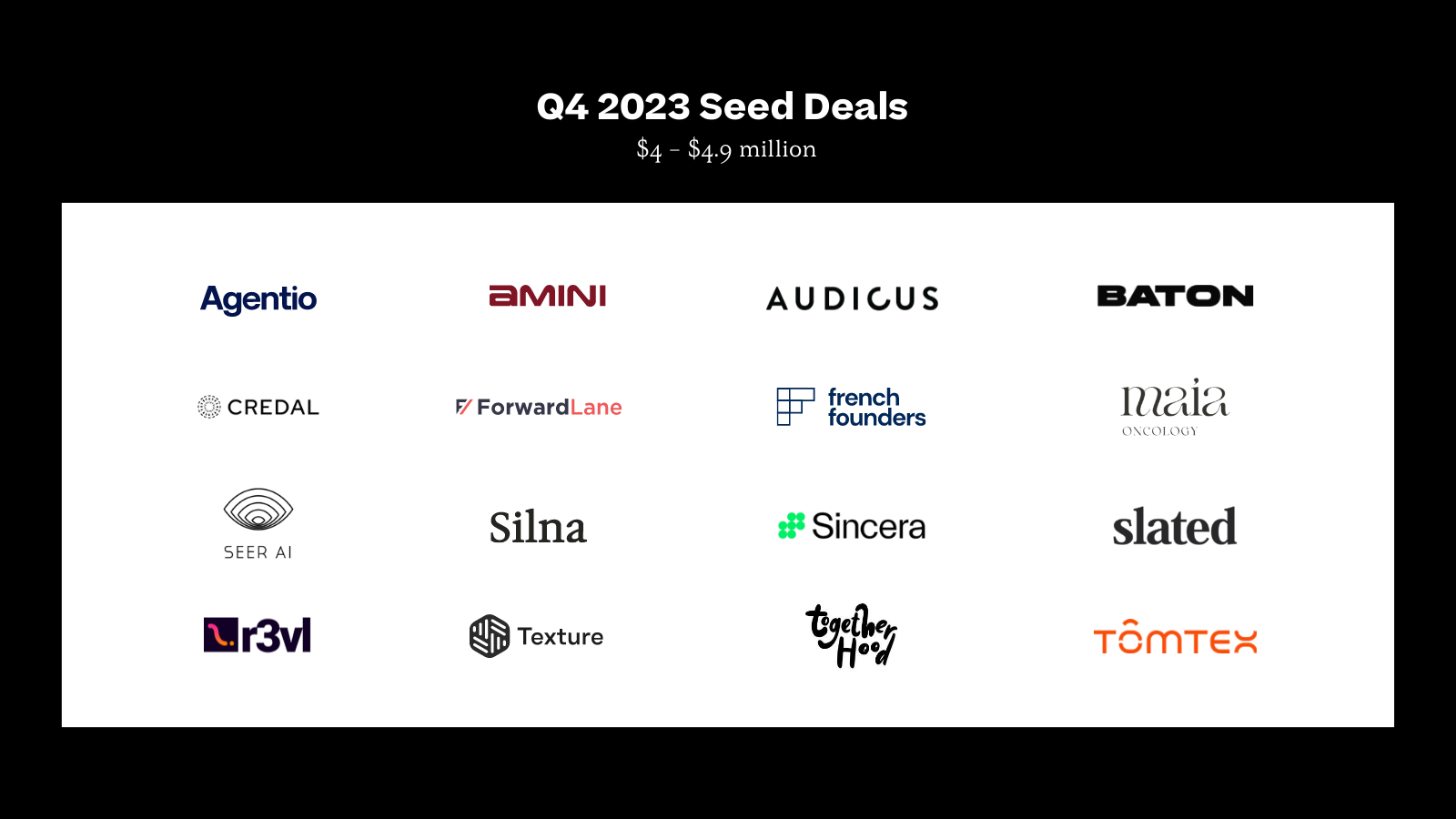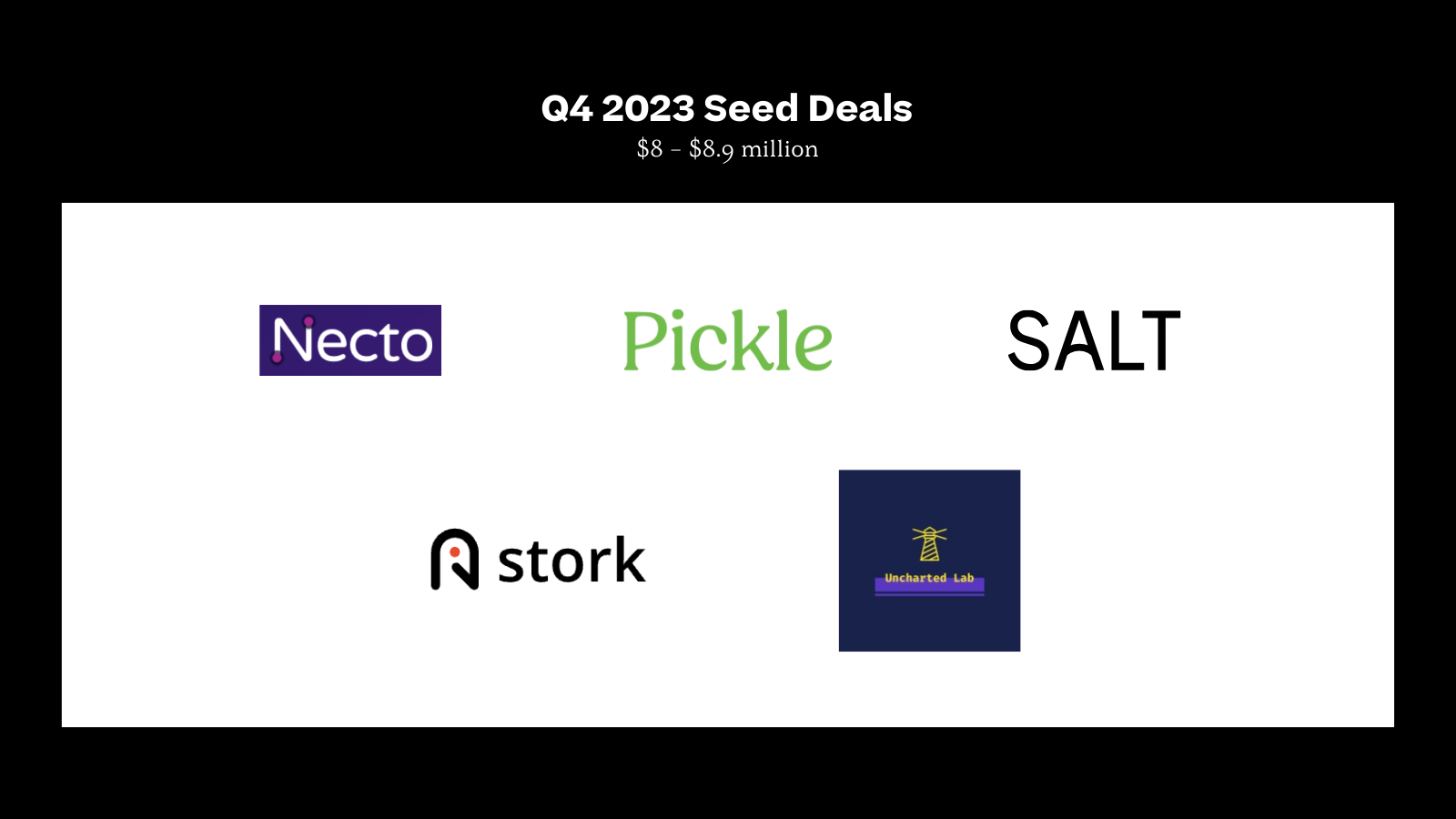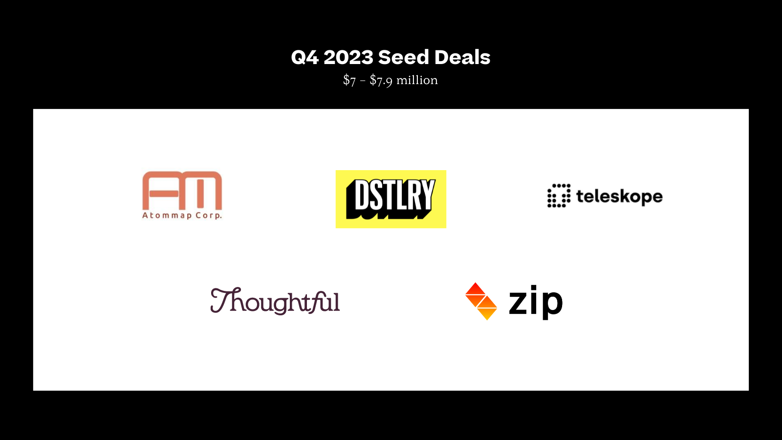 NYC seed deal volume, at 147 total, increased by 7% compared to Q3, and the average amount raised, $4 million, increased by 16%. We know Q4 is typically big for fundraising, and that showed with total funding raised increasing by 15%.