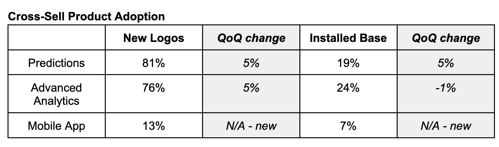 While board members are certainly interested in learning about new product features and enhanced demos, none of that work matters if it does not yield adoption and revenue, so technical teams must include those details in board decks. A simple table like the one below is sufficient, and it’s important to supplement the numbers with qualitative context. In this example, the sales team is doing good work selling the predictions and advanced analytics products to new customers, but there is still an opportunity to do better with existing customers. The mobile app product may be new, which might explain why penetration is still low, but it would be helpful to articulate both a forward-looking target and gameplan for how the company will get there.
