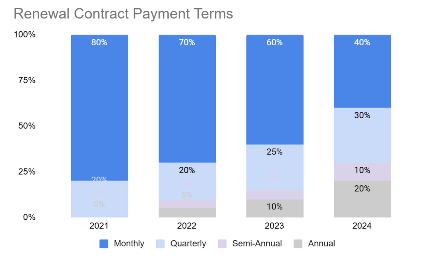 This next chart summarizes the company’s improvement in payment terms; the renewals team is doing good work to transition customers from monthly payment terms to more upfront payment options.