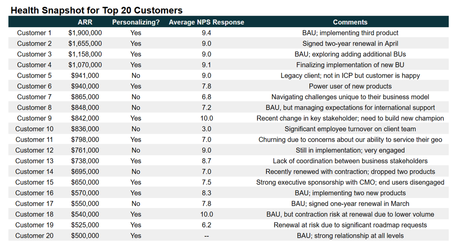 I’ve said it before and I’ll say it over and over again: if a company does everything in their power to make their customers successful (within their financial constraints, of course!), they would have to catastrophically screw something up not to succeed as a business–so a customer success and health snapshot is a critical ingredient in a compelling board update.