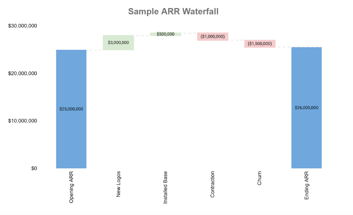 The ARR waterfall is the simplest and most elegant way to explain the ARR additions and subtractions. This visualization is particularly helpful for breaking out ACV contraction vs. full logo churn.