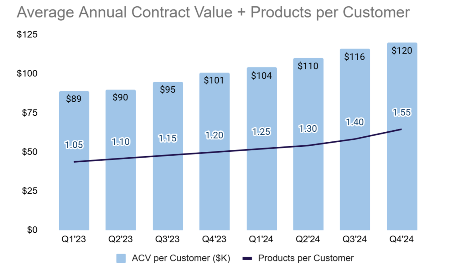 The chart above is a simple way to showcase the progression of average ACV per customer as well as average number of products per customer. In a business that has fewer products to cross-sell and instead drives expansion from selling additional use cases or business units, the products per customer metric could be tweaked to number of use cases per customer.