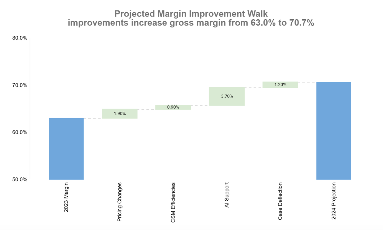 Perhaps unsurprisingly, I’ve turned to the waterfall chart as a powerful visualization to outline the “walk” behind an actual or planned improvement in gross margin. The chart above details a company’s plan to improve gross margin from 63% to 71% this year, with investments in AI support tools playing a material part in that plan.
