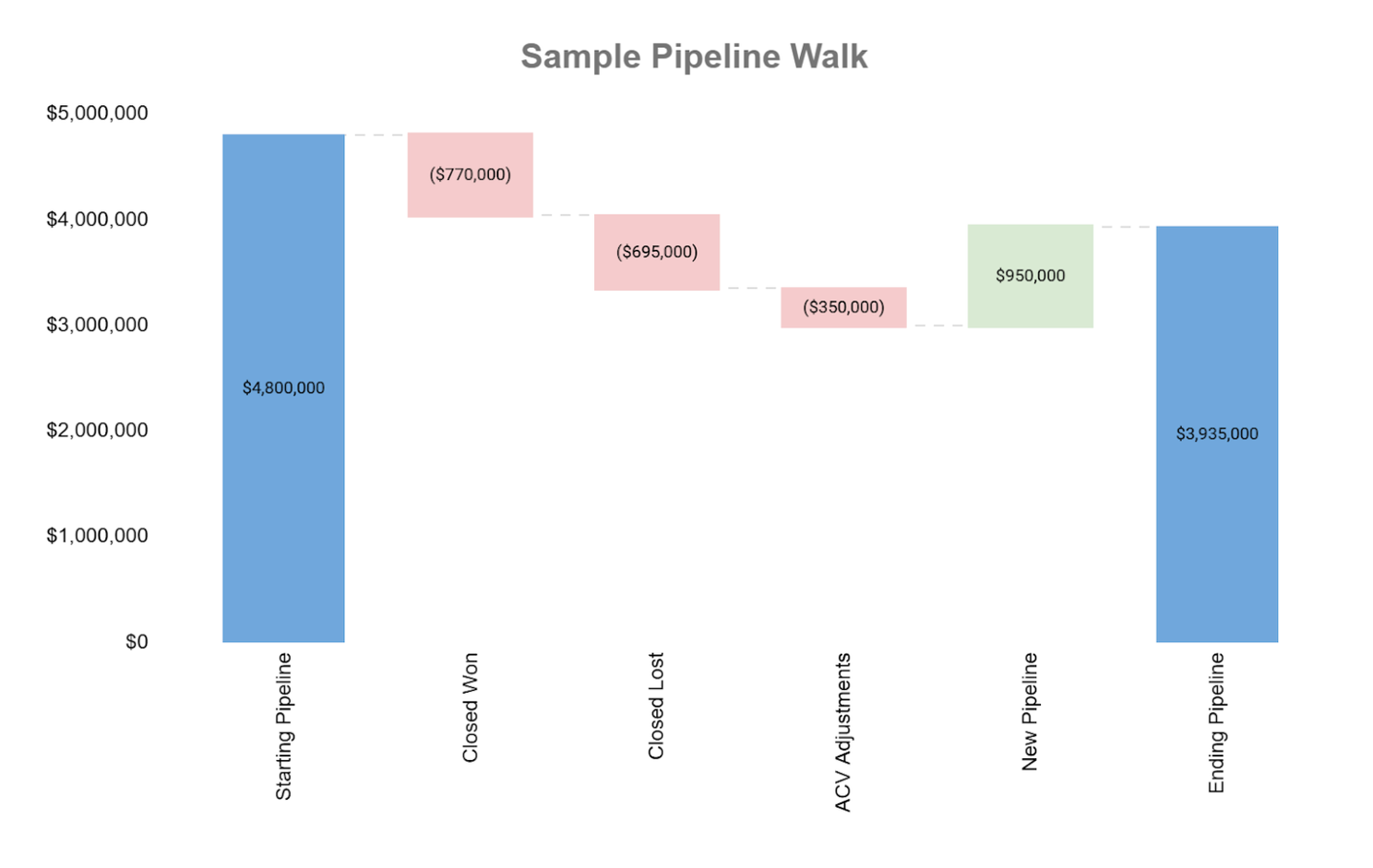 Editor’s note: waterfall charts are helpful visualizations for any “here’s what came in and went out”- type storytelling needs. The next example shows a waterfall view of pipeline dollars in a given period.