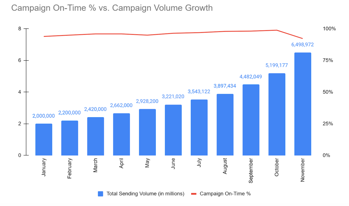 It’s equally important to comment on the reliability and scalability of your platform, as those are paramount to maintaining customer trust. A chart such as the one below contrasts a volume metric with a reliability metric; in this particular example, Company X had scaled reasonably well up until November, which requires some explanation. Perhaps this was a breaking news notifications company and the system was overwhelmed by Election Day news!
