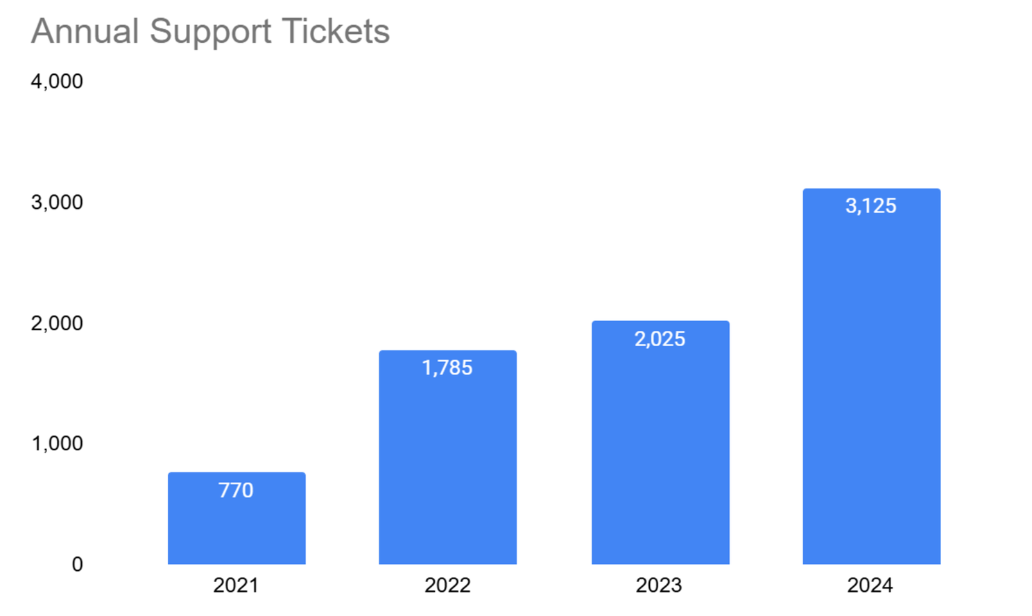 In the charts below, you’ll immediately notice that normalizing tickets per $1MM ARR (e.g. the company had 770 tickets vis-a-vis $10MM ARR in 2021 and then 3,125 tickets vis-a-vis $125MM ARR In 2024) tells a far different story than simply looking at ticket volume on its own.
