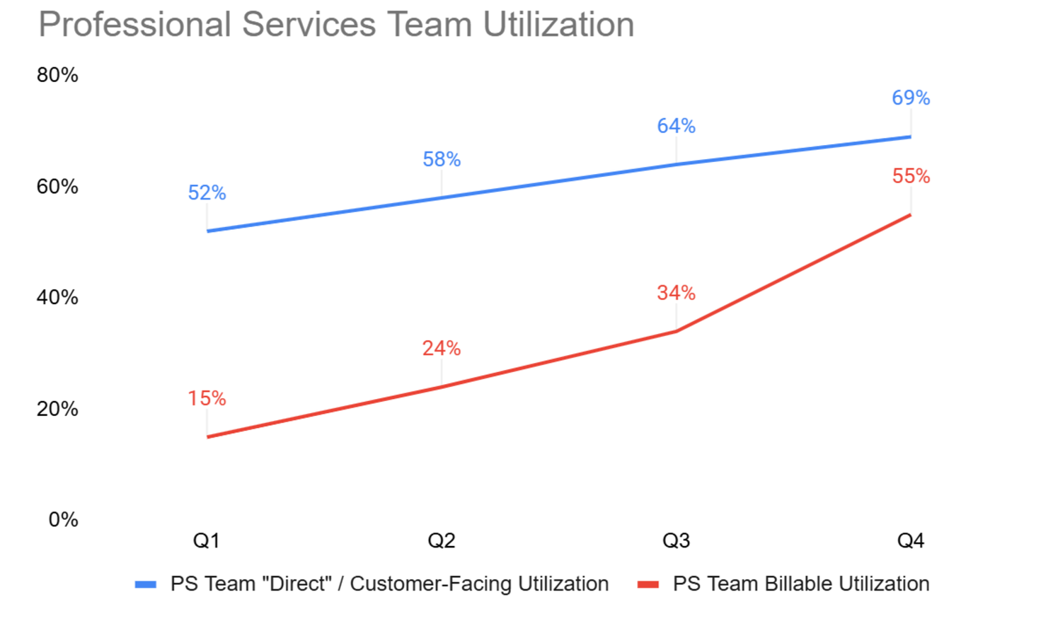 As companies work to ensure their professional services functions are at least breaking even, all eyes need to be on utilization rates for that team. The chart below summarizes two different types of utilization 1) customer-facing time (blue line) and 2) billable utilization (red line), aka what portion of the team’s time could be billed to a customer.