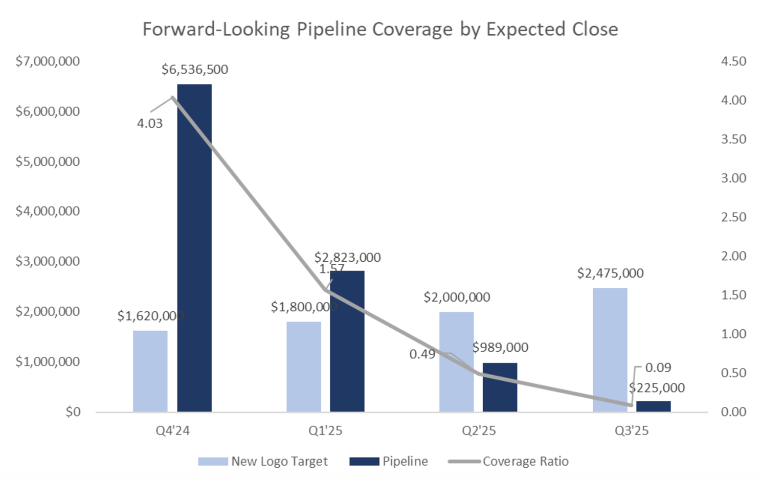 In this example, if we assume Company X has a 25% win rate (requiring 4x coverage) and a six-month sales cycle, we immediately become concerned about Q1, where we only have 1.6x coverage today. Given the length of the sales cycle and the reality that we’re in late Q4, Q1’25 feels like a stretch. To de-risk the Q1 plan, Company X’s commercial leader should be thinking about 1) SPIFs to accelerate pipeline creation right now (so there is at least some degree of hope of generating opportunities that could close in Q1) and 2) closely examining commercial opportunities in the existing customer base knowing that the new logo target will likely be a miss.