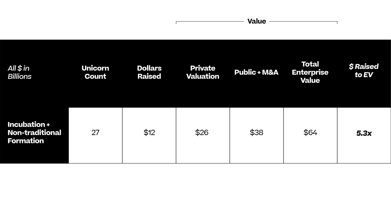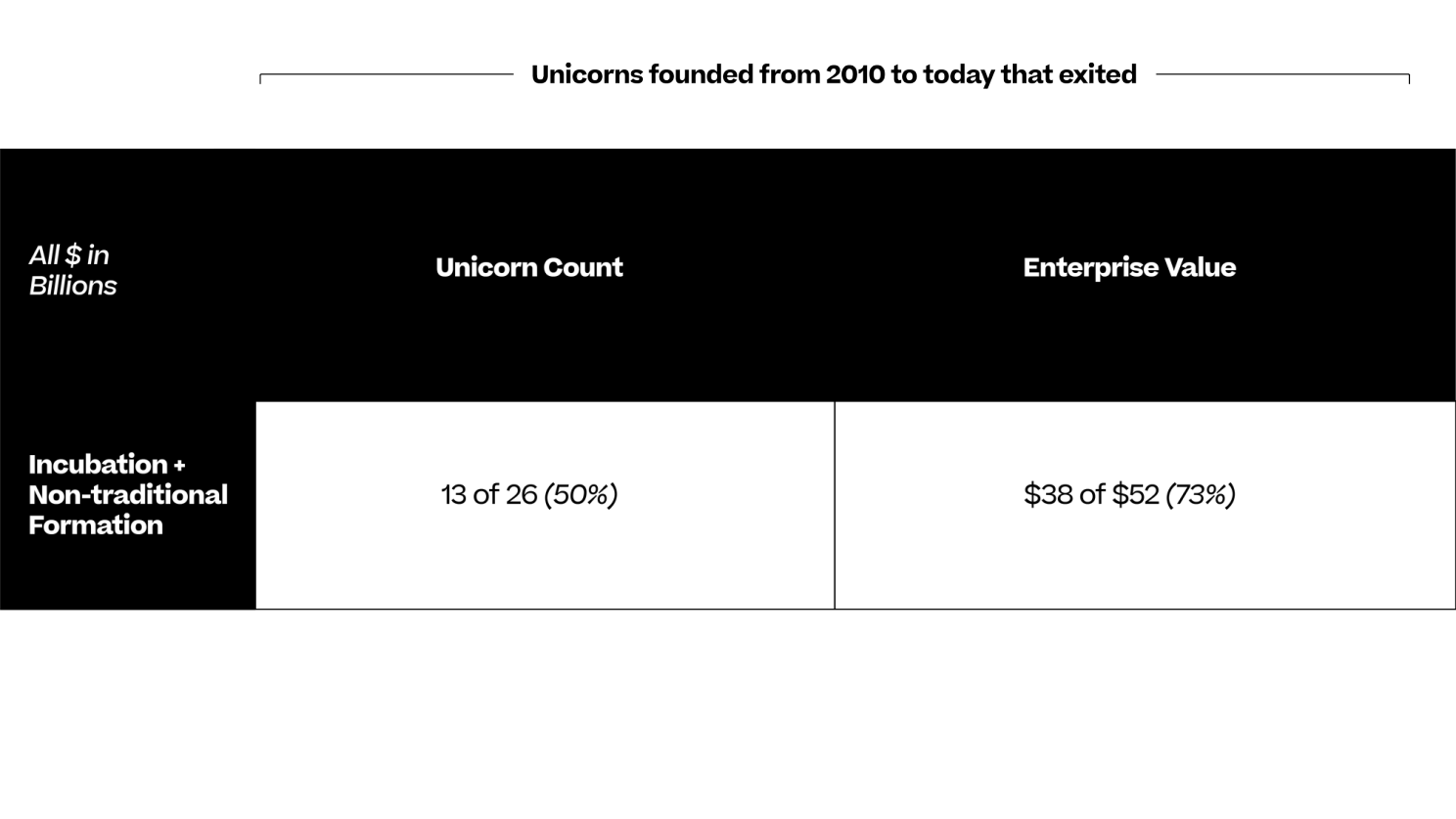 - Incubation or non-traditional venture financed companies account for ~30% of all the unicorns. And these companies have also greatly outperformed from an exits perspective when compared to the rest of the market — accounting for ~73% of the liquidity in the market from unicorns in this time period