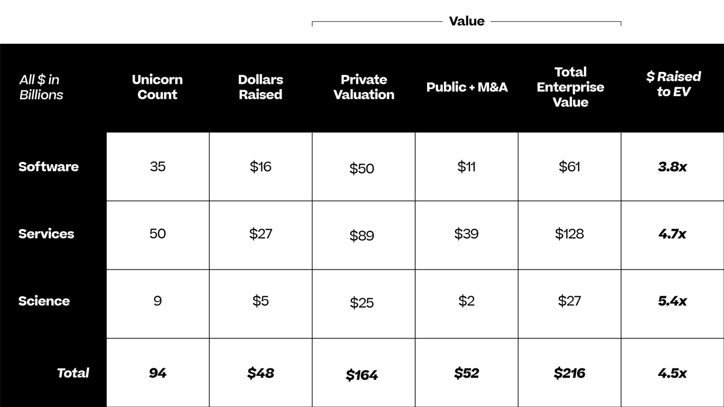 When evaluating different categories, we used dollars raised and enterprise value creation as a means to get a sense of efficiency for dollars invested across each of these categories (i.e. dollars raised/total enterprise value).