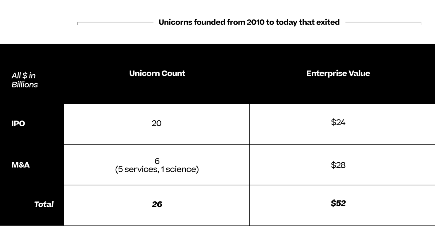 We analyzed current healthcare unicorns, companies that went public, and M&A for companies created since 2010 onwards and looked at a combination of healthcare subsectors, enterprise value/market cap, and liquidity.