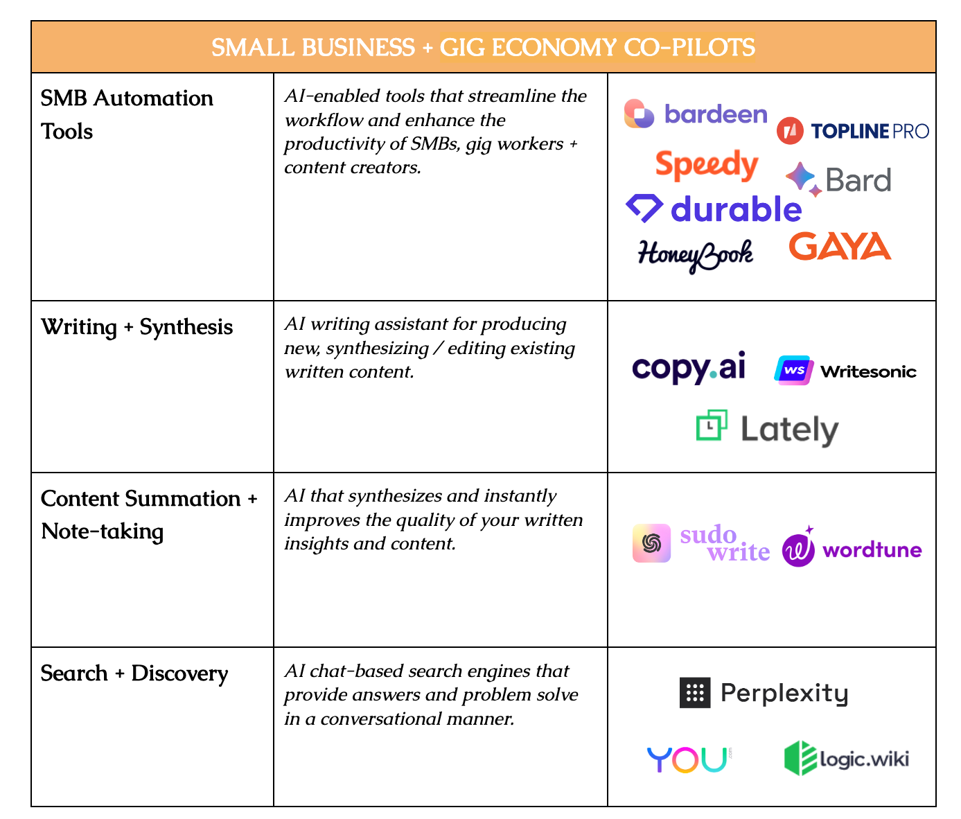From copywriting (Copy.ai), to content summation (Mem.ai), and even verticalized back office automation (Gayafi), we buy into a future where products create 10X output for time-strapped freelancers and SMBs, particularly in areas where business growth, back office automation, and content creation have clear ways to be automated. We see incredible opportunity to bring these tools to the more than 33 million small businesses in the U.S. who will gain dramatic improvements in their quality of life by embracing these automations in their workflows. As a result, tools such as ToplinePro, which look to help drive revenue in a vertical focused manner, leading to better lives for SMB owners, are quite appealing to us.