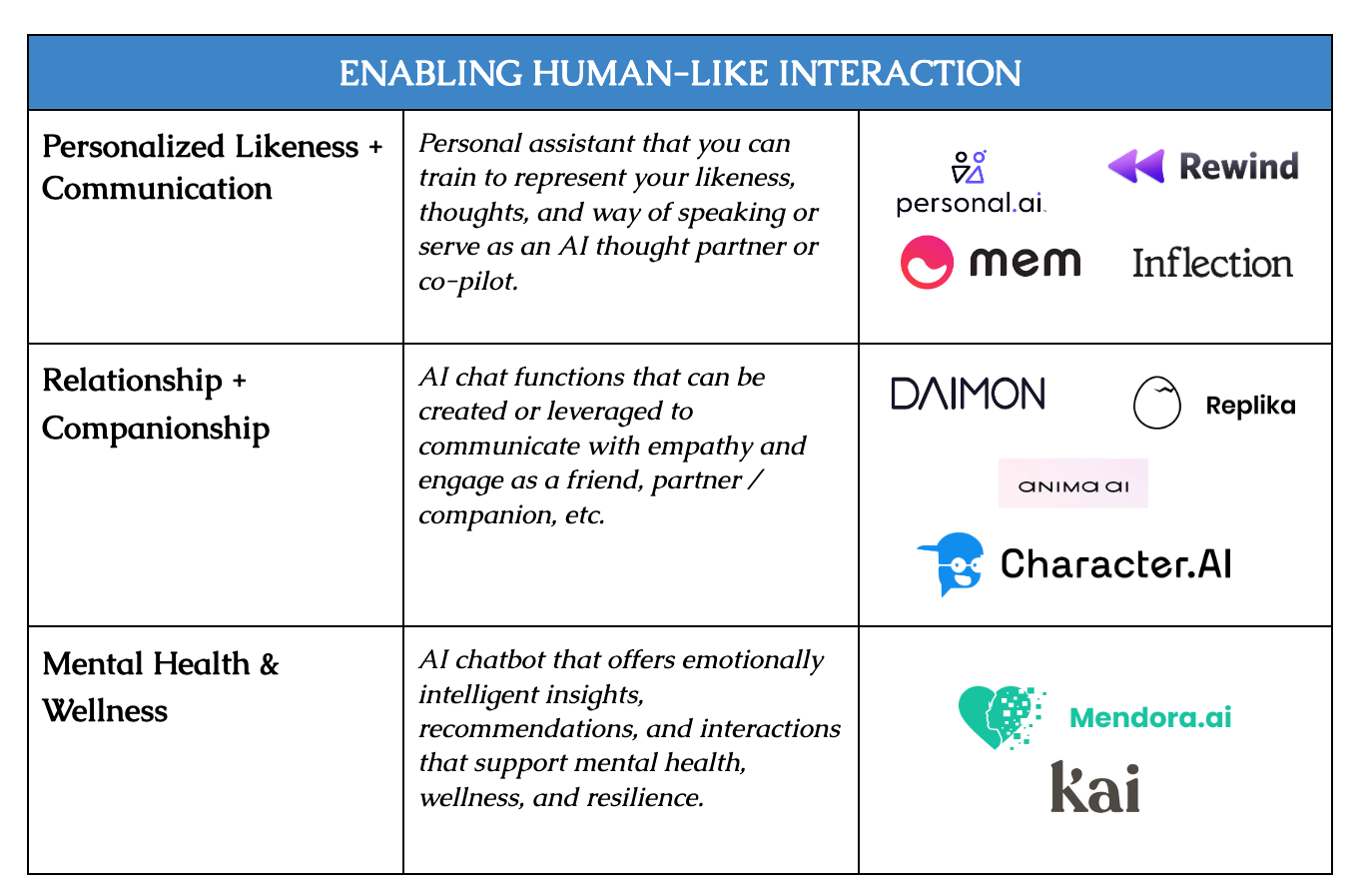 From products enabling communication with others through a personalized likeness model (Personal AI), to products facilitating connections with companions (Daimon Labs) to products focused on communication in support of one’s mental health (Mendora), we’re excited about use cases that offer low-cost opportunities to mimic human interaction and leverage personal connection to retain memories, build connections, and surface helpful and individualized insights to improve lives.