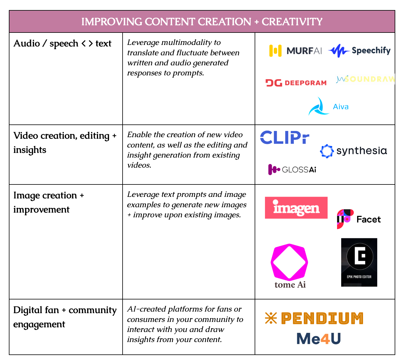 One of the clearest strengths of generative AI technology today lies in its ability to assist consumers in generating new and interactive content, unleashing a different level of productivity/output, and creating a different level of personalization based on one's own knowledge base and personal preferences. With the plethora of consumer use cases made possible by advancements in generative AI technology, we’re excited about use cases that are leveraging these advanced capabilities to democratize access to information, insights, and productivity enablers while improving the experience to do so tenfold. We believe the best investments will come from deeply personalized experiences or new consumer concepts that have inherent network effects. Many of these new products, whether investable or not, will change consumer experiences forever. Here are some use cases we’ve seen of late that are likely to define the future we live in:
