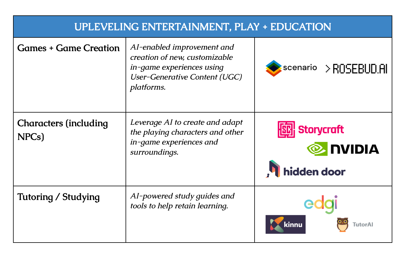 From games / game creation (Rosebud.ai), to characters / roleplaying (Hidden Door), we’re seeing a rise in entertainment + play use cases that put consumers in the driver's seat of how they engage in play and create a world that entertains and can make learning enjoyable.