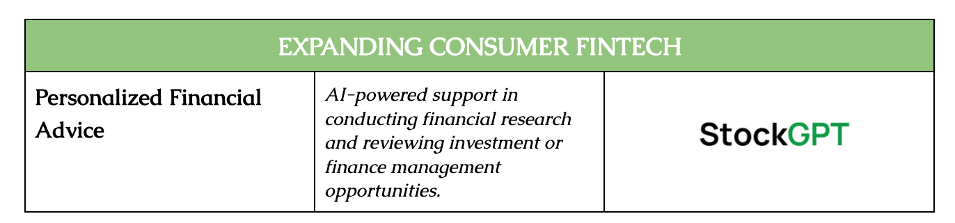 While fintech is a tricky use case for generative AI due to the critical nature of accuracy for outputs, we’re excited to see a blend of traditional and generative AI technologies surfacing to address consumer needs, particularly across personalized financial advice and support (StockGPT). Other use cases we anticipate will see increased opportunity include fighting bills, financial advisor co-pilots, and improved banking chatbots.
