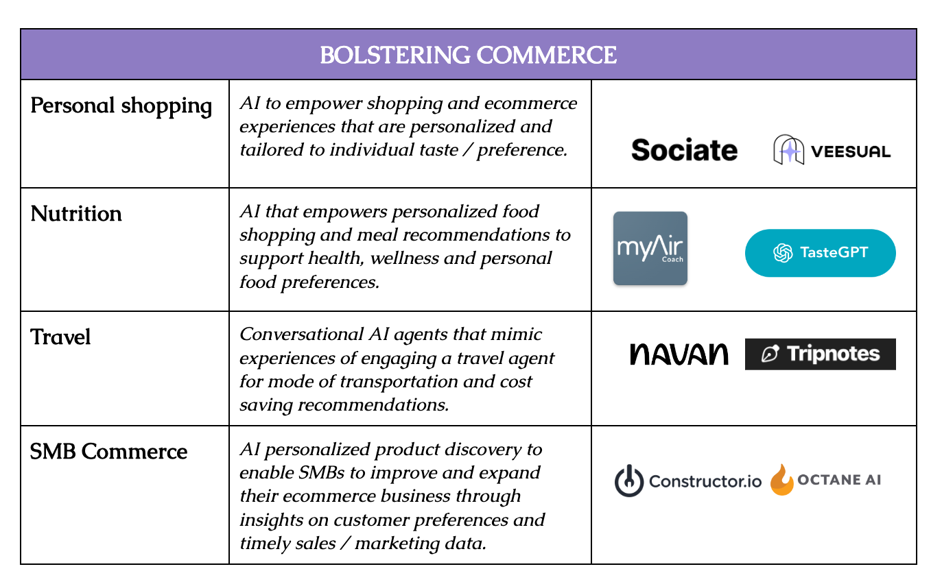 From use cases across personal shopping (Octane AI), Nutrition (MyAir), and Travel (Tripnotes), we find use cases fascinating that leverage improved pattern recognition to personalize consumer purchasing experiences or optimize the ability for SMBs to use the technology for product discovery.