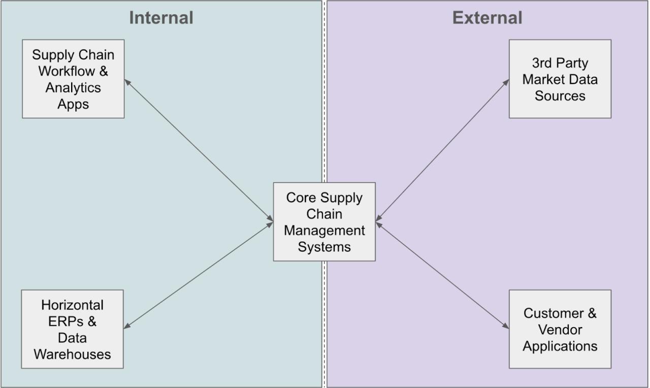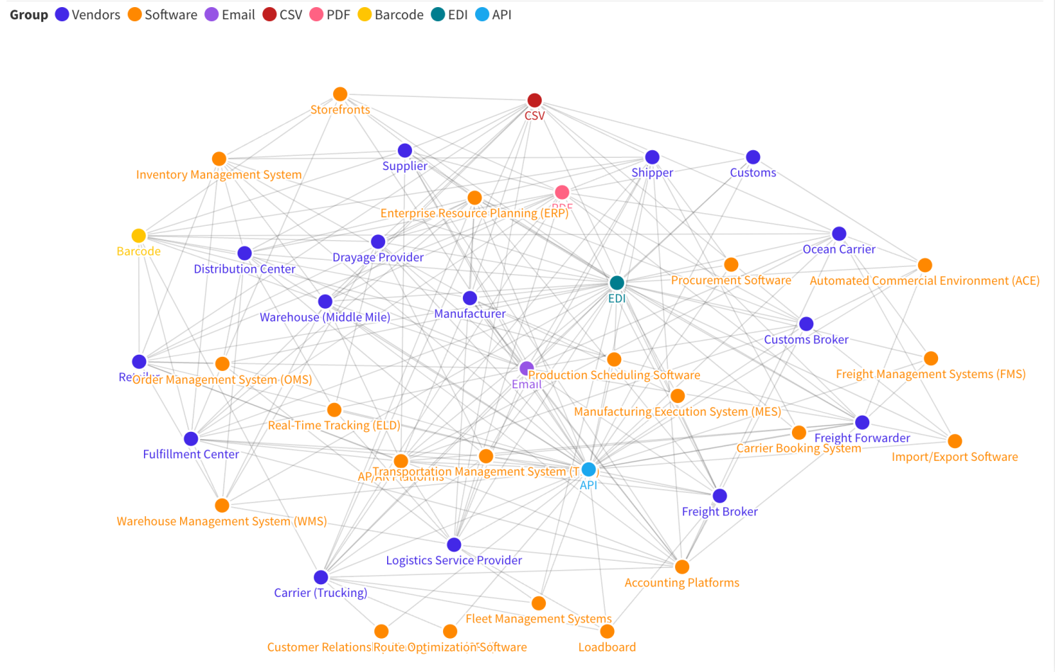 The data sharing needs of a modern supply chain include a huge number of participants, each with their own tech stack. A large enterprise will have horizontal ERPs (Oracle, SAP, Netsuite, etc) and data warehouses (Azure, AWS, Snowflake, etc) that need to connect to their core supply chain management systems (TMS, WMS, etc). They will also have additional supply chain analytics and execution applications (Lyric, O9, GoodShip, Loop, Parade, Project44, etc) that need to integrate with their core systems. Then on top of that they need to connect with all their suppliers, customers, transportation vendors, and more.