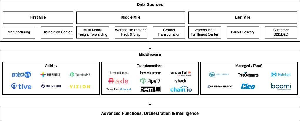 We've seen plenty of startups building unified APIs for specific pieces of supply chain data. These opportunities have all been difficult for us to get excited about because they are either too niche, not defensible, or heavily service-oriented. That said, we know that building these integrations is a huge pain point for software players in the supply chain stack and vendors and customers in supply chain orgs trying to integrate with each other. In this piece we’ll break down the different integrations that are needed in the supply chain, the players that exist in the space today, and where we see opportunities for new, venture scale businesses.