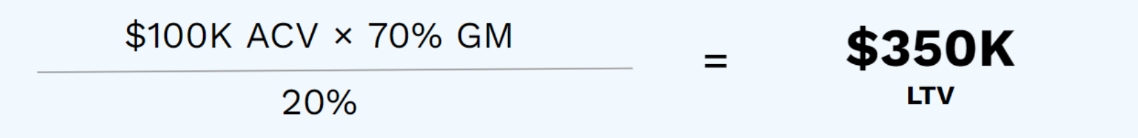 In a hypothetical scenario in which Company X has $100K average ACVs, 70% gross margin, and 20% logo churn, their LTV works out to $350,000 (see below). In a world where we aspire to have a 3:1 ratio of LTV/CAC (customer acquisition cost), Company X determines that they can spend ~$117,000 to acquire a new logo.