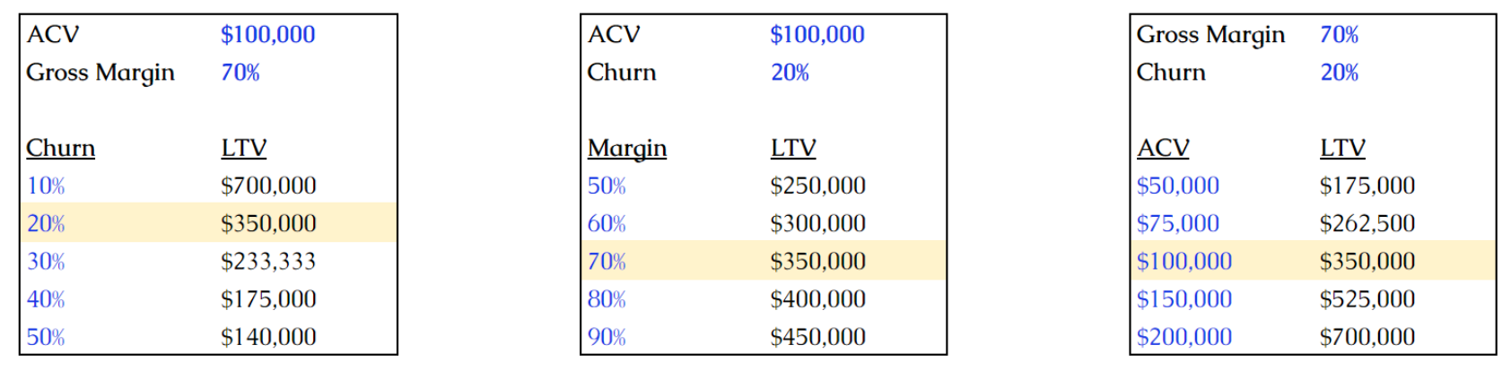 - If ACV and gross margin remain constant but we reduce churn from 20% to 10%,LTV doubles to $700,000.